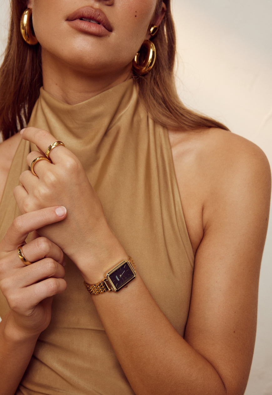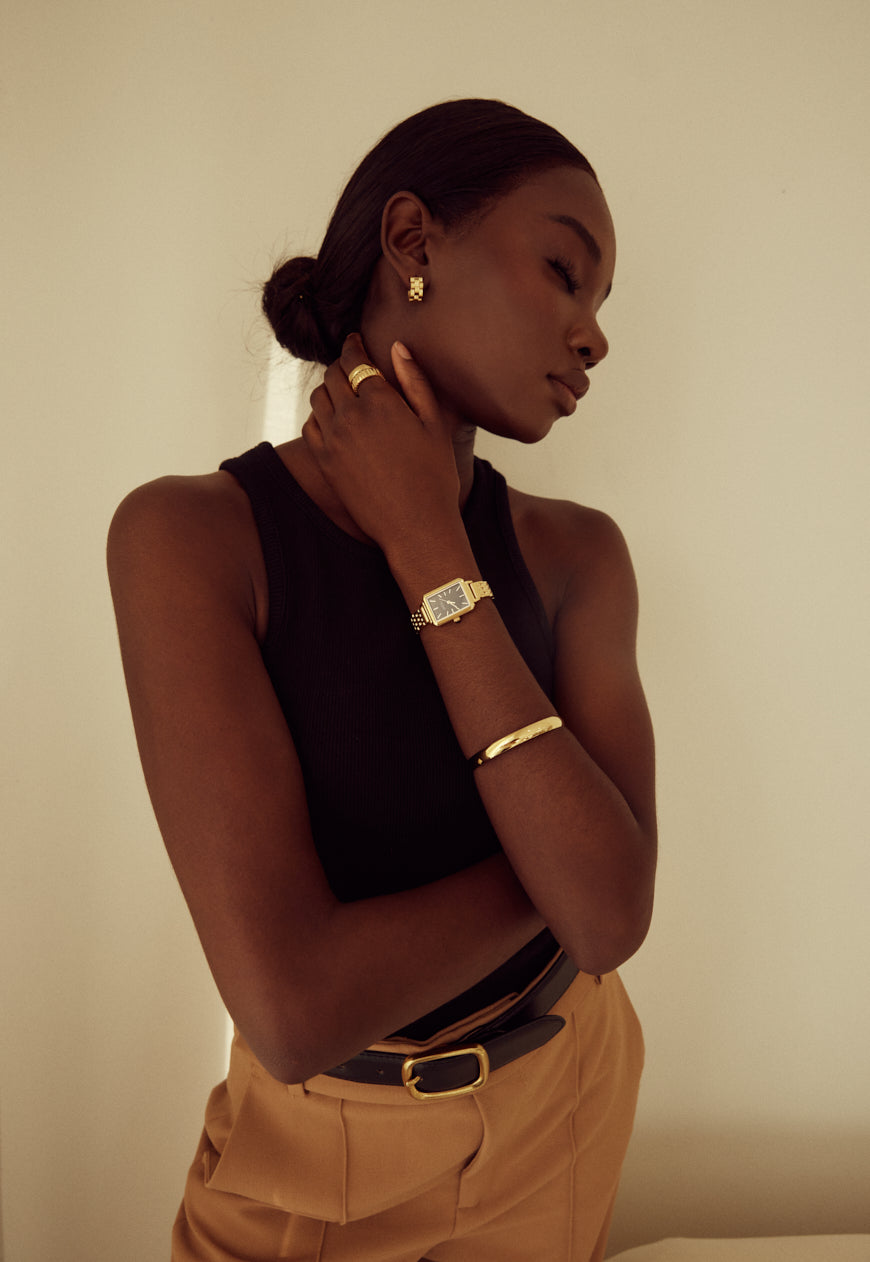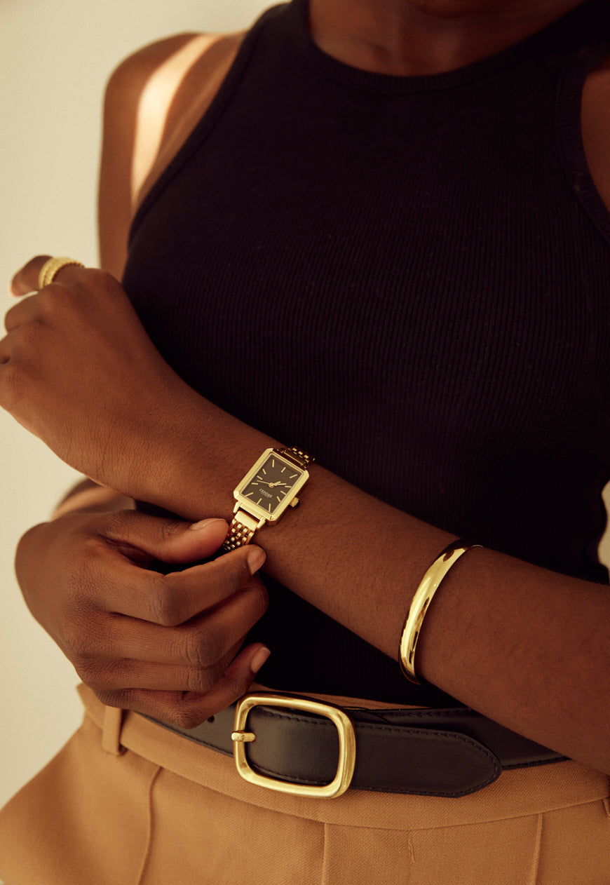 Allow us to introduce you to the Mason Watch, a timepiece that combines form and function. It’s crafted from 18k gold plated stainless steel and has an engineer band with a polished finish. Embrace the moody allure of this style in black and pair it with dark neutrals for a look imbued with classic Parisian flair.