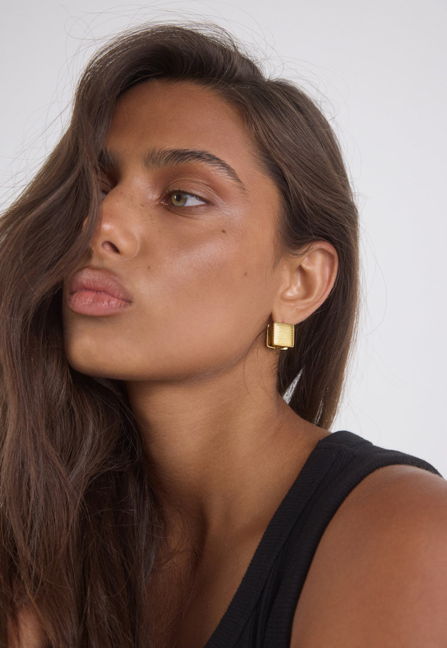 Meet the Willia Huggie, a simplified staple featuring a semi-curved square silhouette with horizontal fine line engraving providing an elevated finish. With it’s easy click through huggie design, the Willia have been crafted with 18k Premium Gold Plating on Stainless Steel makes this piece the perfect staple to compliment any ensemble.