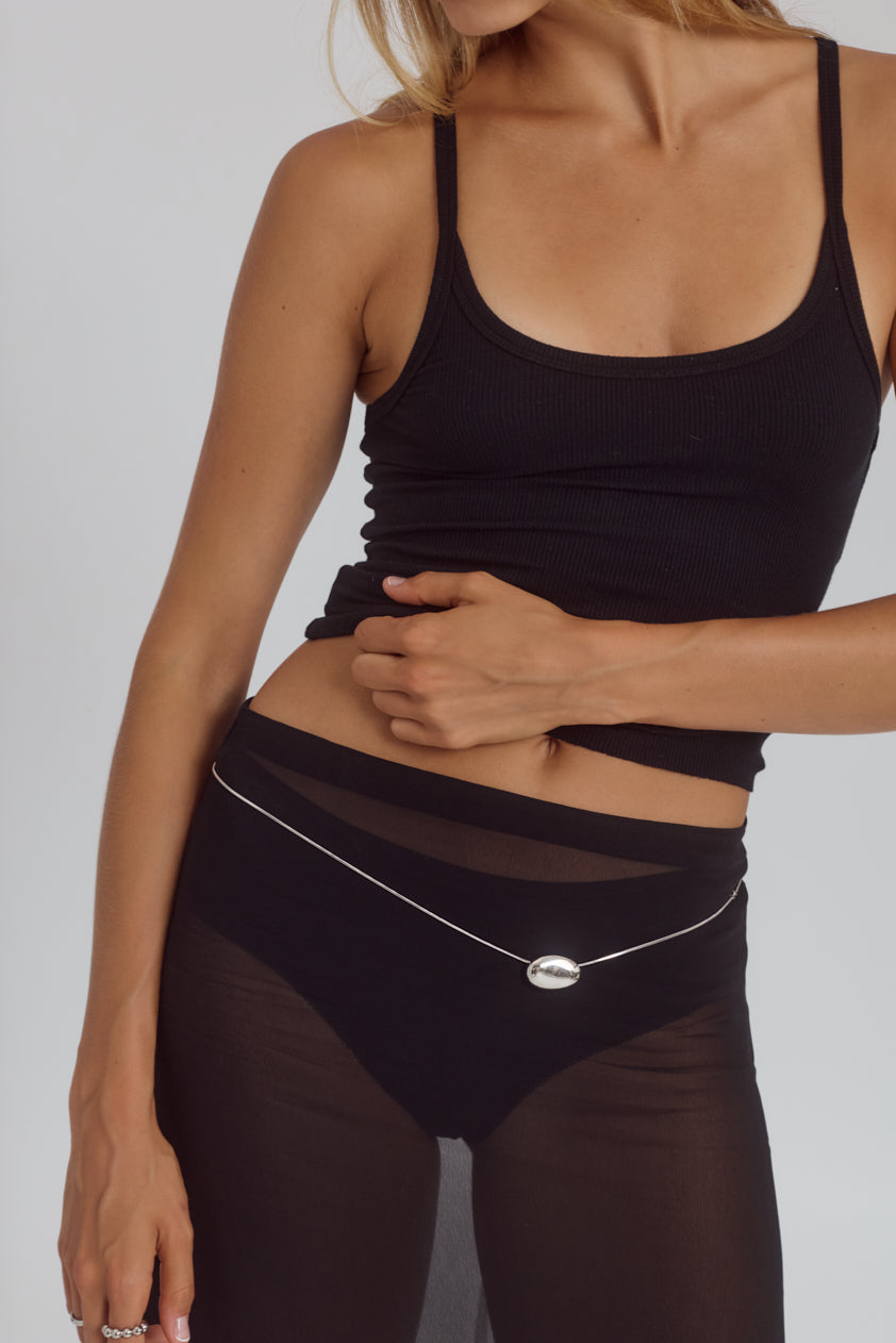 The Sloane Belt features a rounded, polished pendant strung on a delicate chain. Designed to be worn at the waist or adjusted into the Sloane Necklace, this versatile piece transitions seamlessly from day to night.