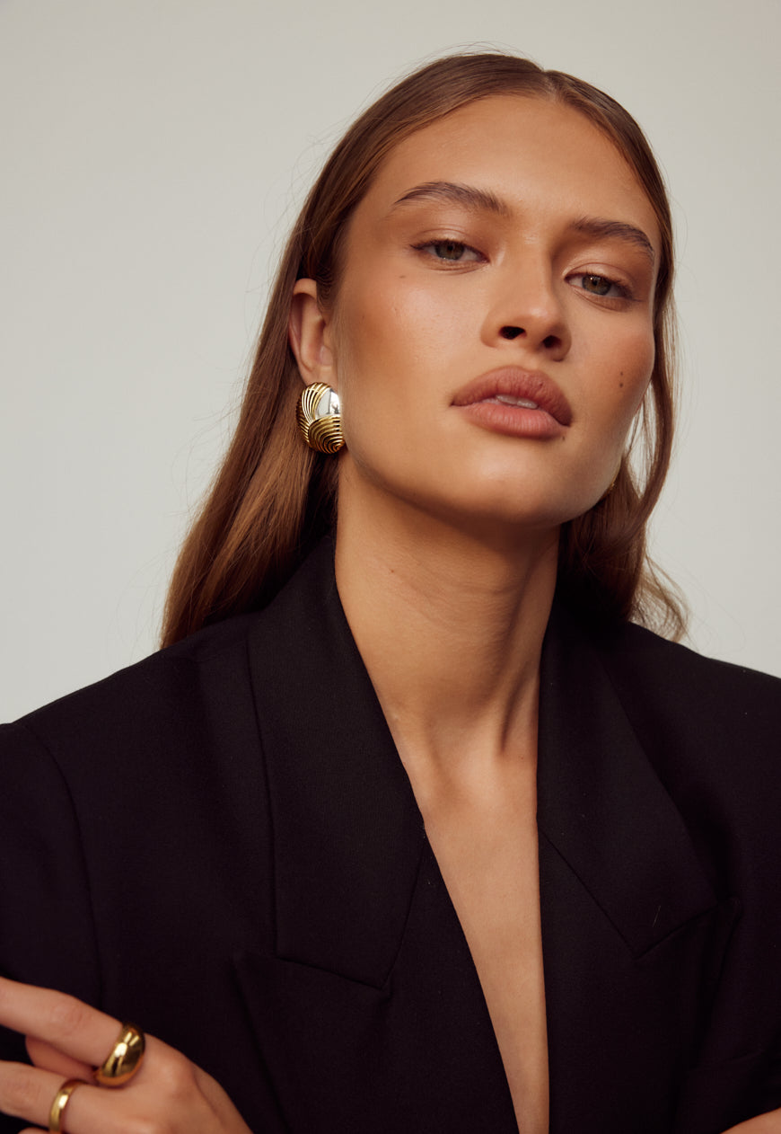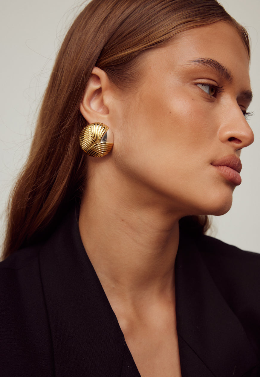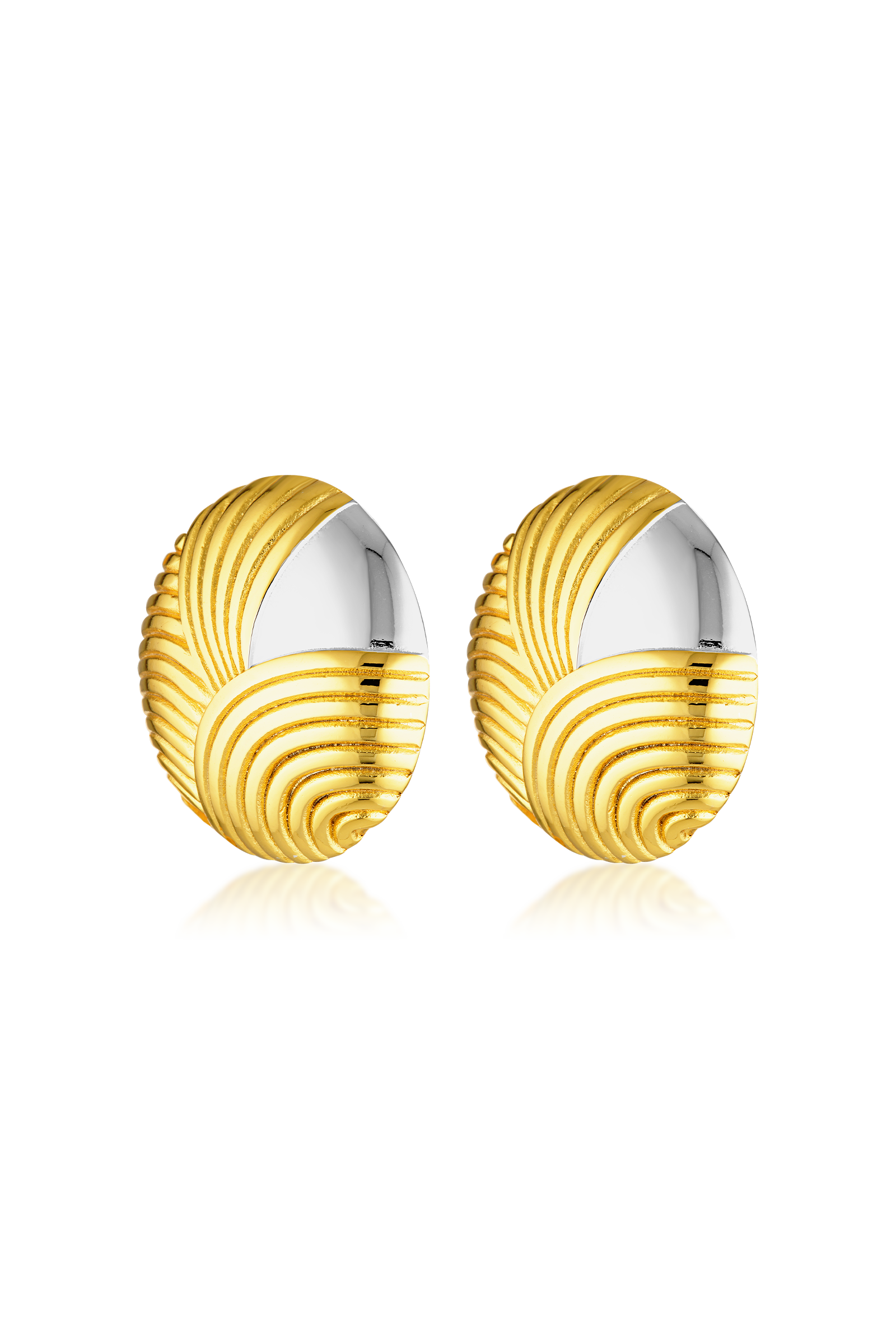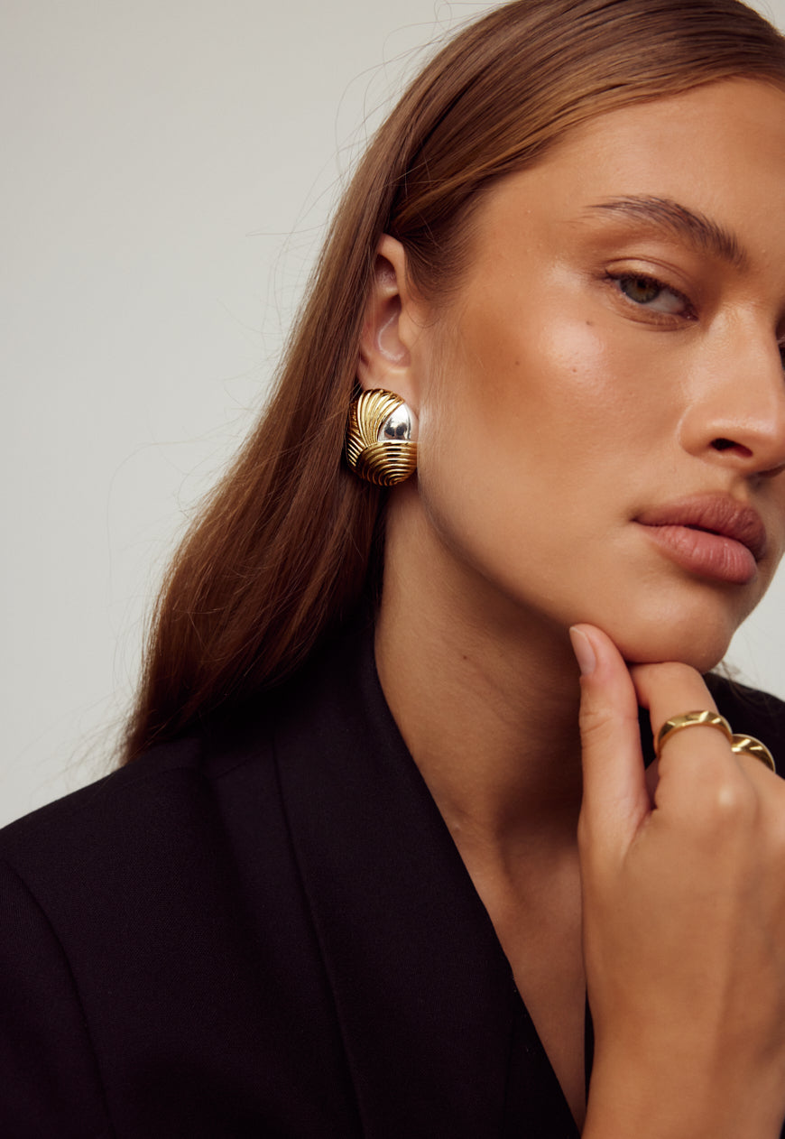 Harmonising geometry and abstraction, our Bambi Earrings seamlessly transcend trends. Crafted from 18k gold-plating and high polish stainless steel, they boast delicate line-work engraving on the surface featuring a two tone finish and are elegantly secured by our custom earring backings for instant lift.