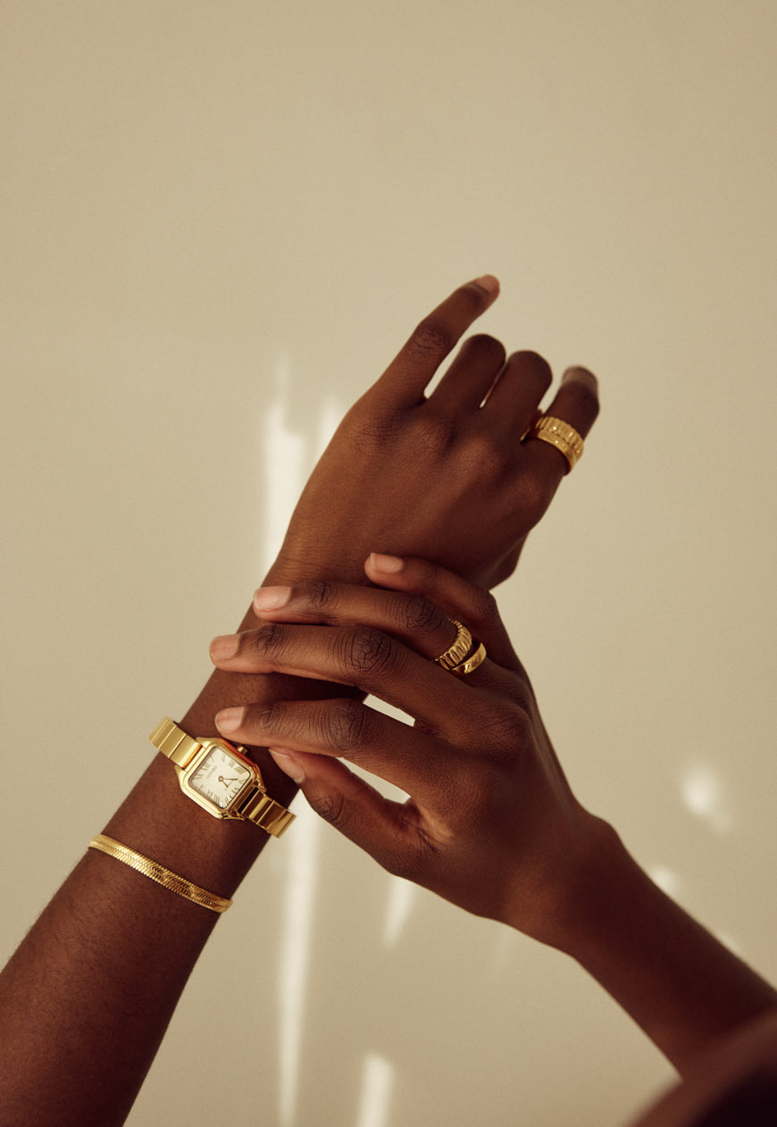 Rich, warm, and softly luminous – our signature gold finish. Designed to make a subtle statement, each piece is plated over high-quality stainless steel for enduring wear.