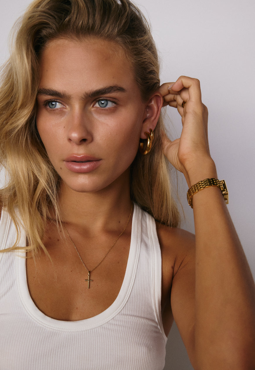 Rich, warm, and softly luminous – our signature gold finish. Designed to make a subtle statement, each piece is plated over high-quality stainless steel for enduring wear.