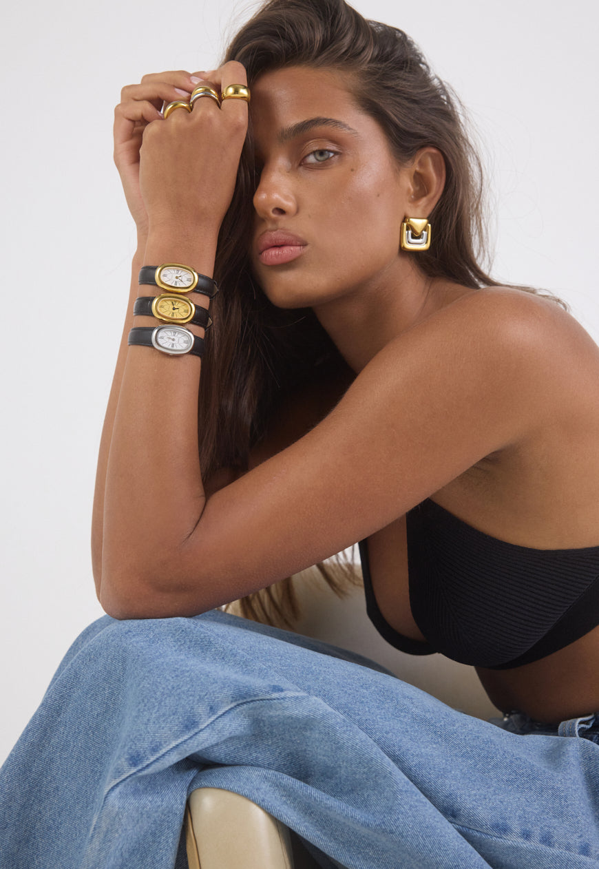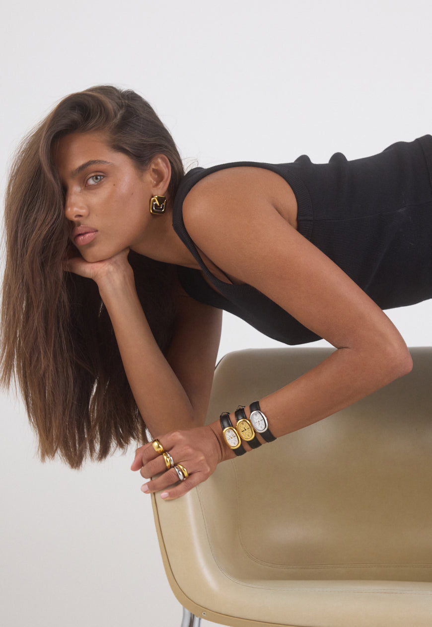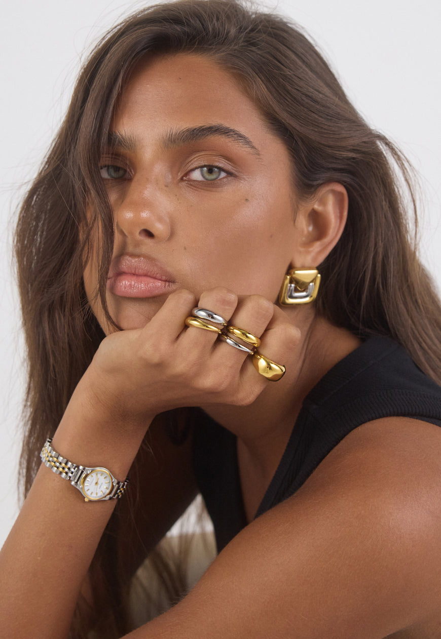 Rich, warm, and softly luminous – our signature gold finish. Designed to make a subtle statement, each piece is plated over high-quality stainless steel for enduring wear.