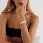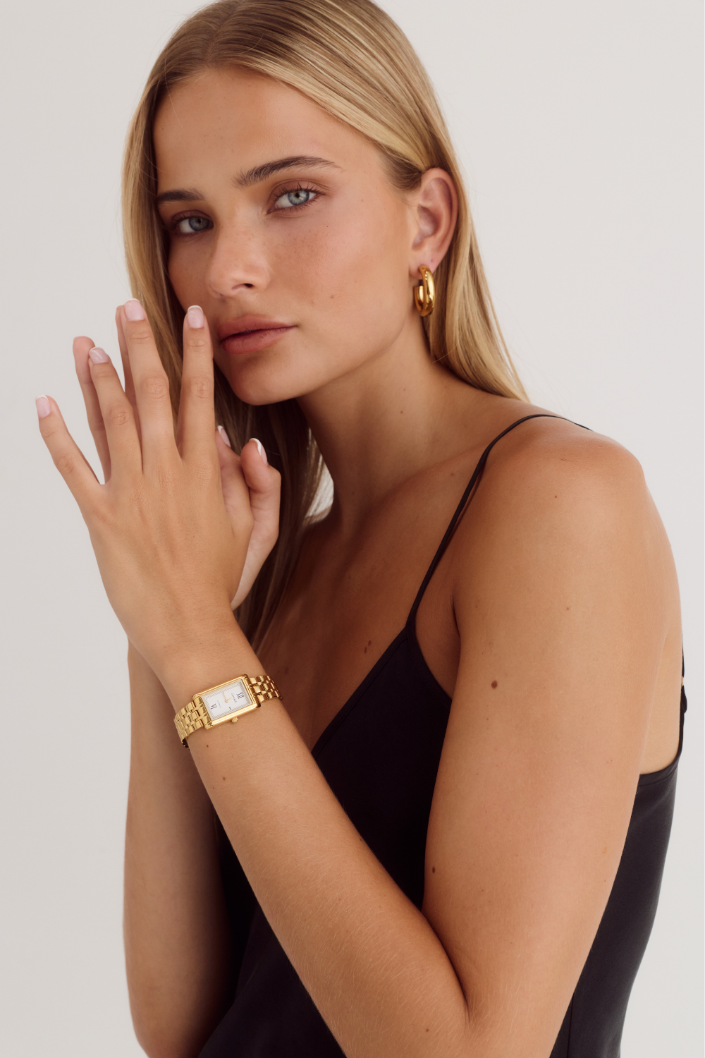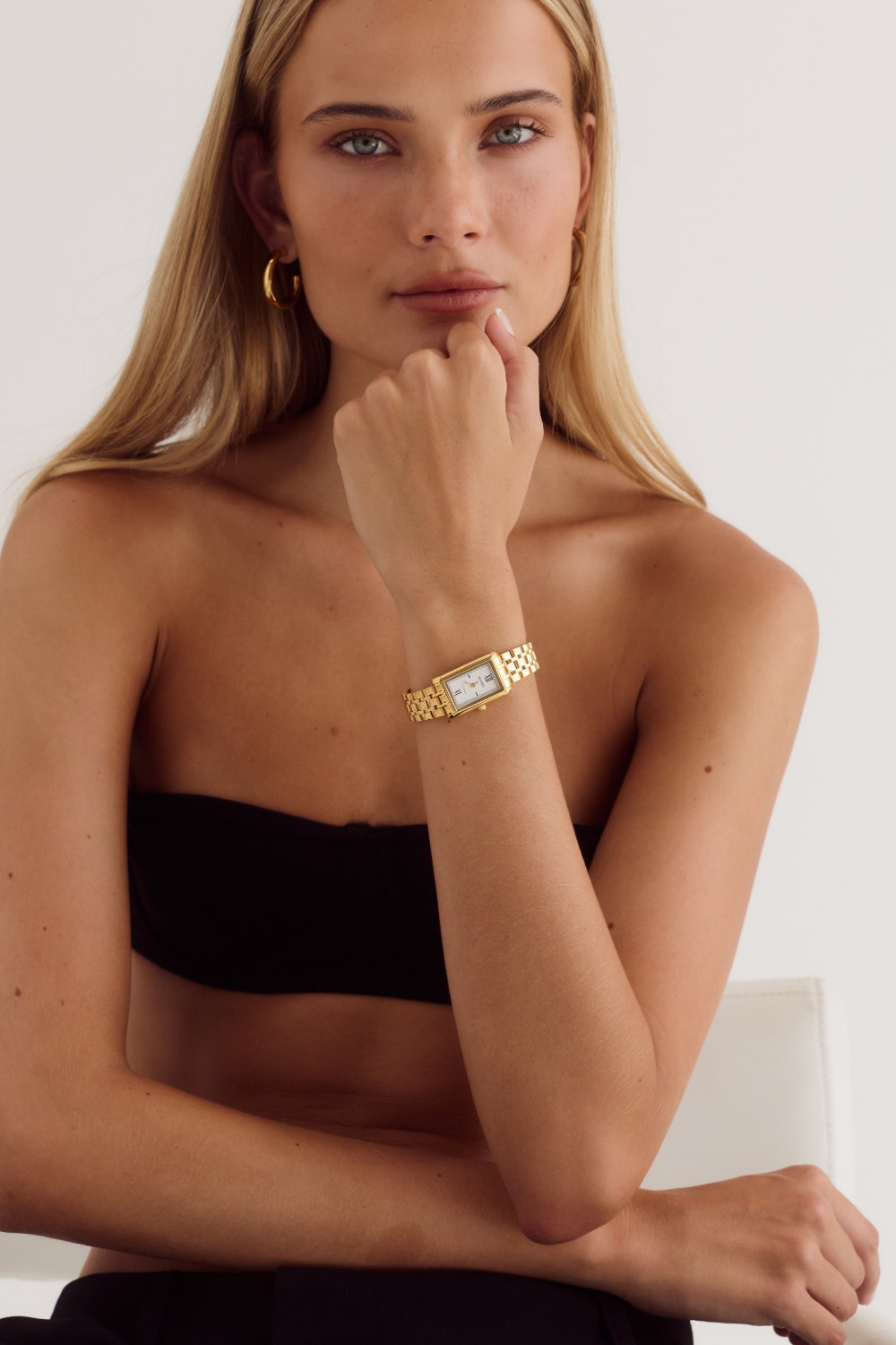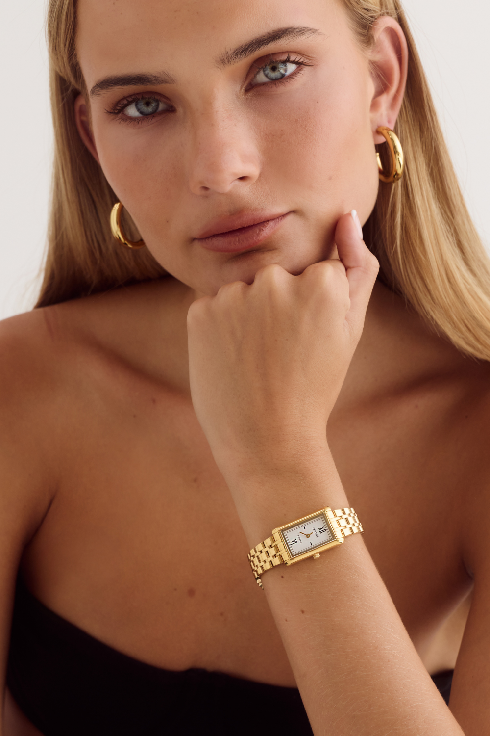 Crafted from 18k premium gold plated stainless steel, featuring a rectangular silhouette and signature roman numeral dial.