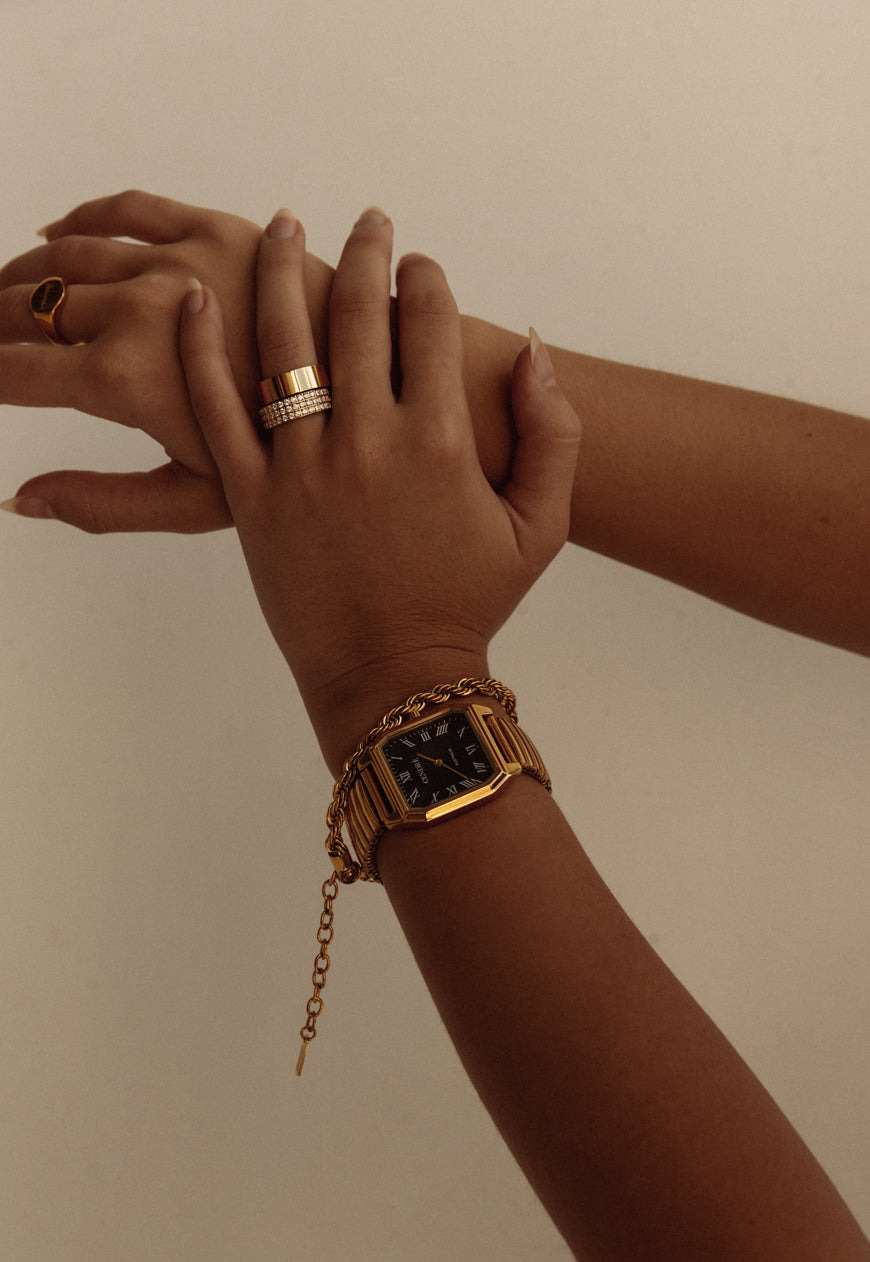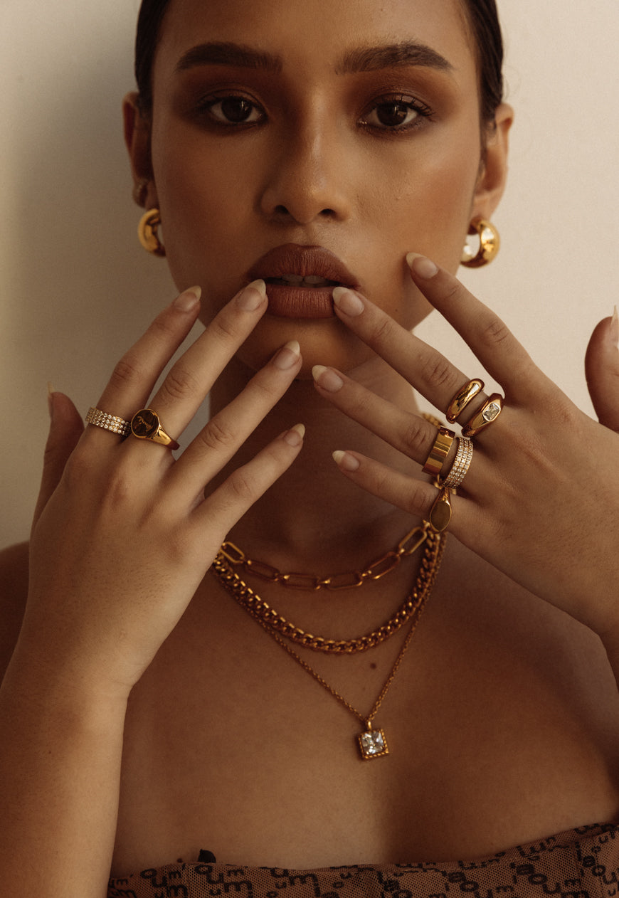 Rich, warm, and softly luminous – our signature gold finish. Designed to make a subtle statement, each piece is plated over high-quality stainless steel for enduring wear.