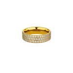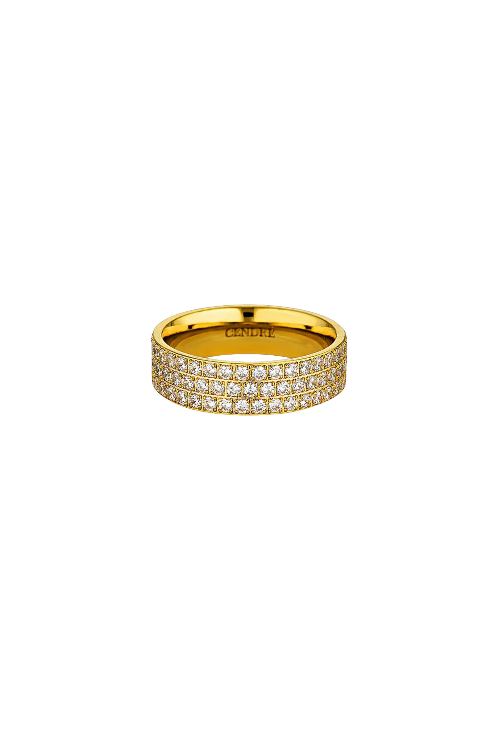 Inspired by Hepburn's white gold, stackable eternity band, the Kendall Cigar Ring is a glorious celebration of all that glimmers. It is crafted from 18k gold plated stainless steel and features clear cubic zirconia stones in a classic pavé setting. This ring will add luminosity to any look and we recommend wearing it with your favourite minimal ensemble.