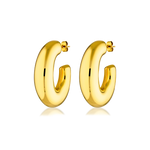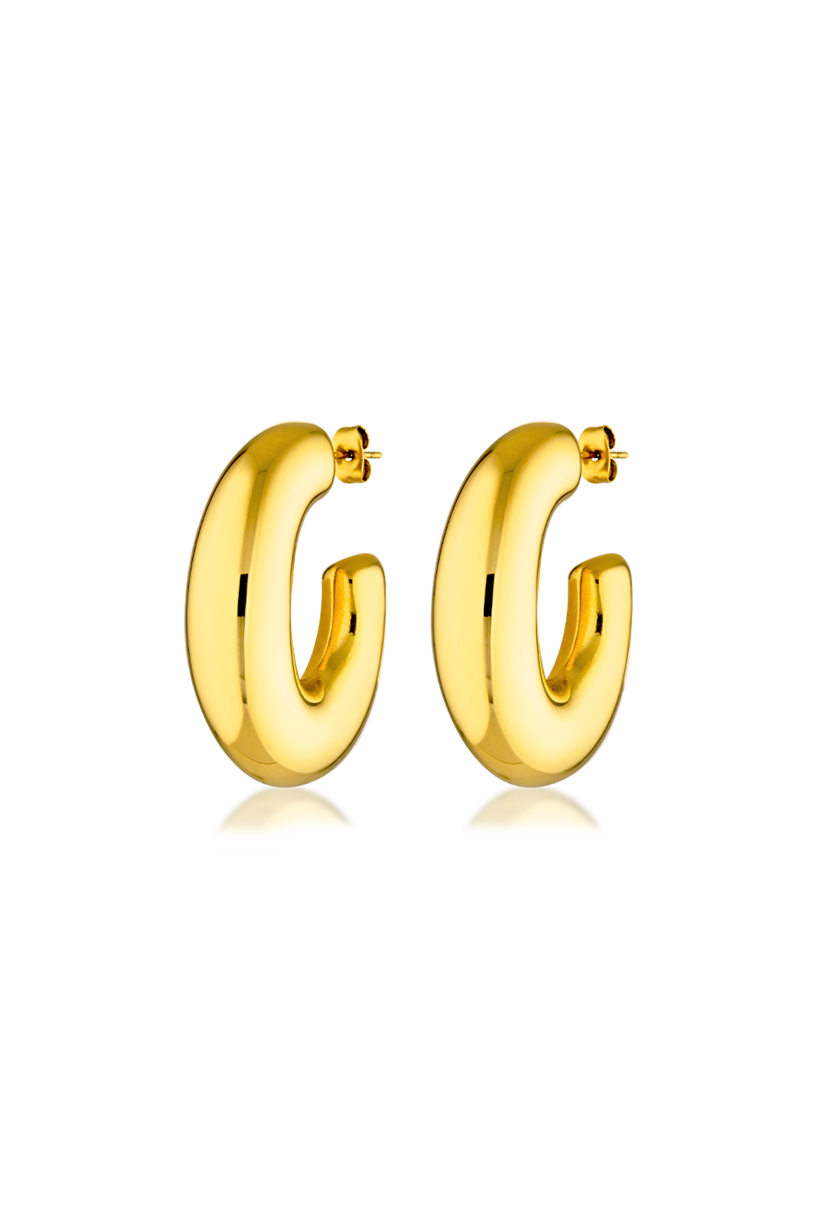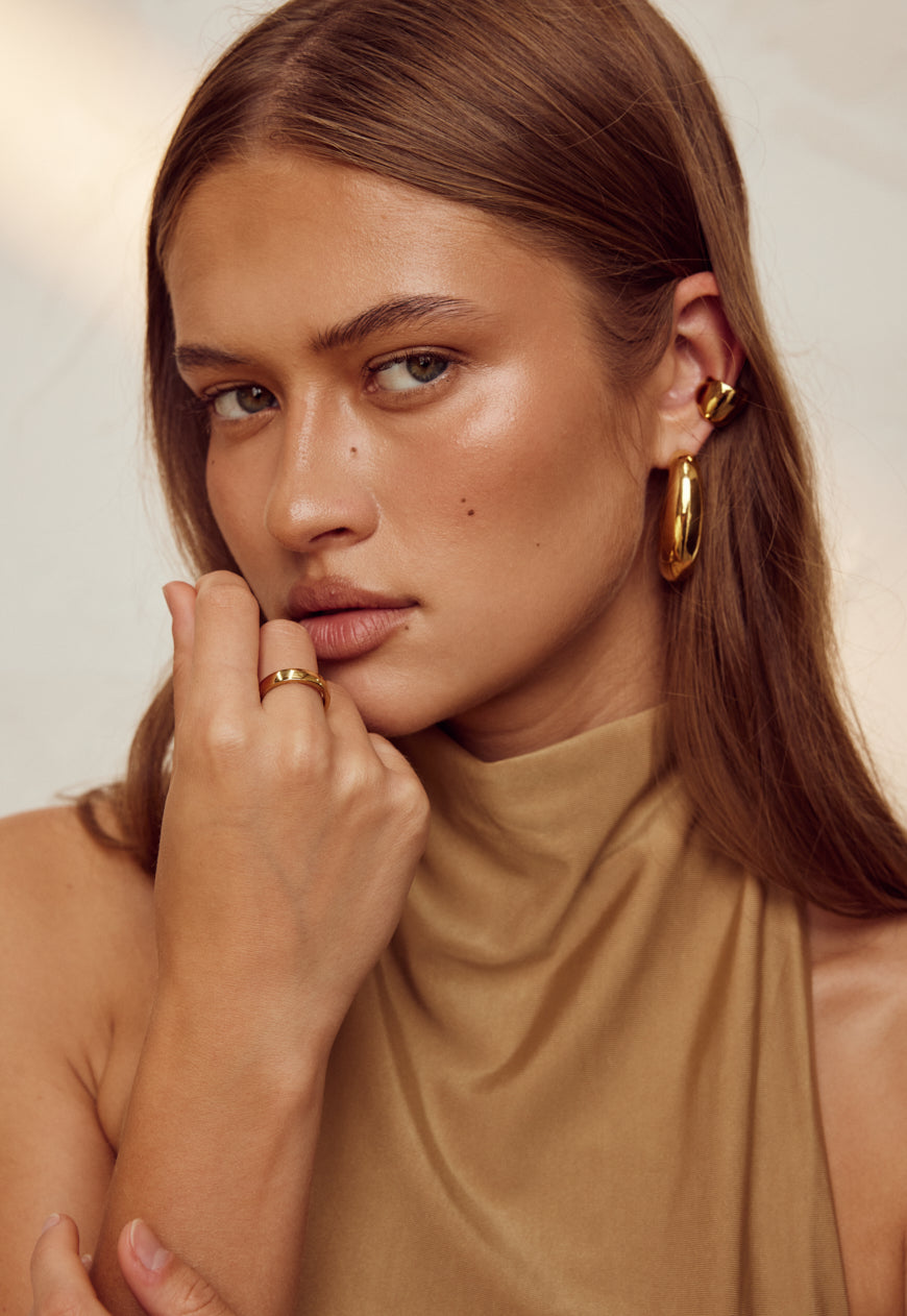 What's better than a standard pair of gold hoops? The Kiki Hoop Earrings. They’re a contemporary imagining of the much-loved hoop design with a slightly modified shape. These hoops are crafted from 18k gold plated stainless steel, are secured by our custom earring backings for instant lift, and are lightweight despite their solid design. These infinitely wearable styles can be paired with anything but we especially love wearing ours with the Camelia Necklace.