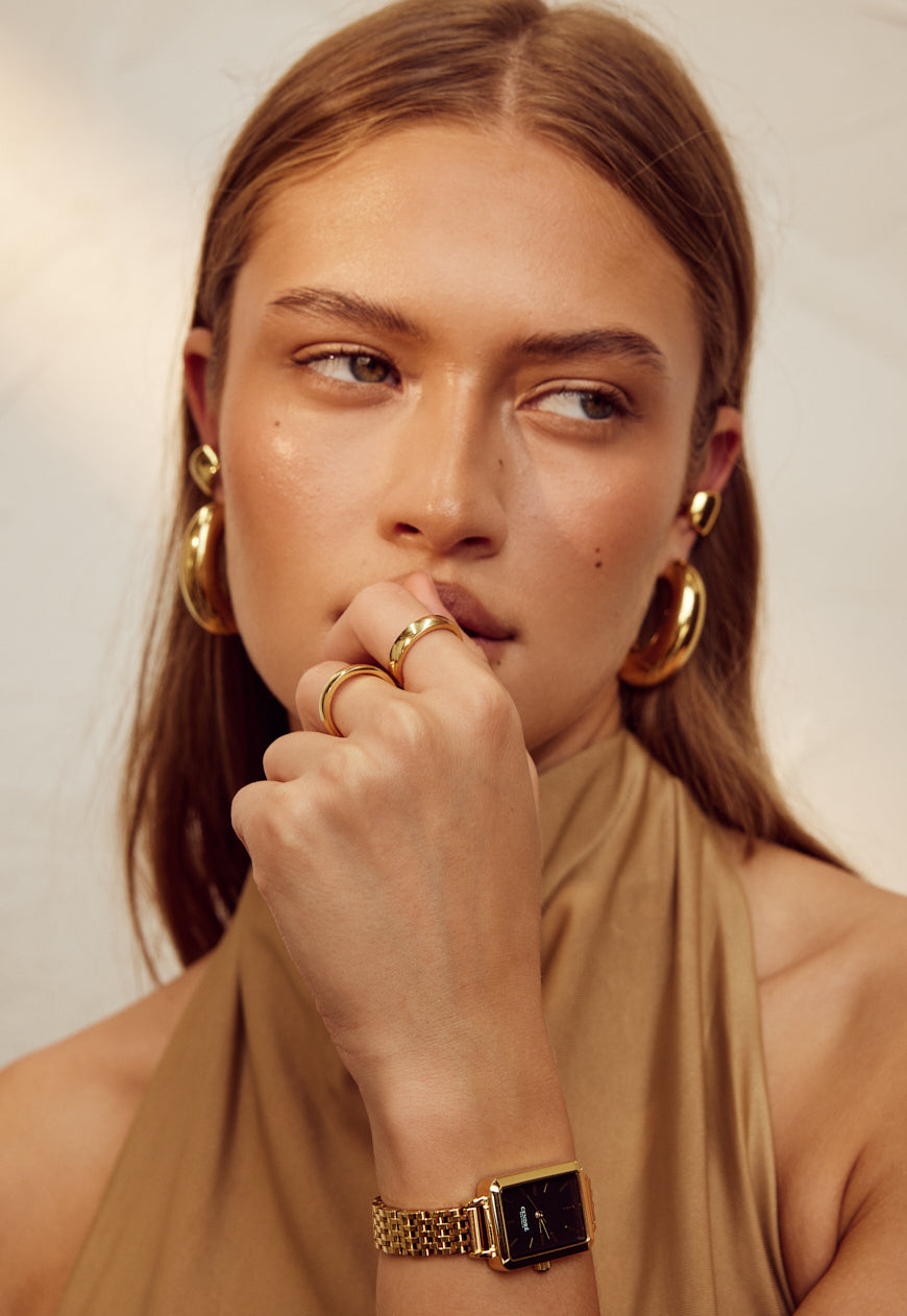 Rich, warm, and softly luminous – our signature gold finish. Designed to make a subtle statement, each piece is plated over high-quality stainless steel for enduring wear.