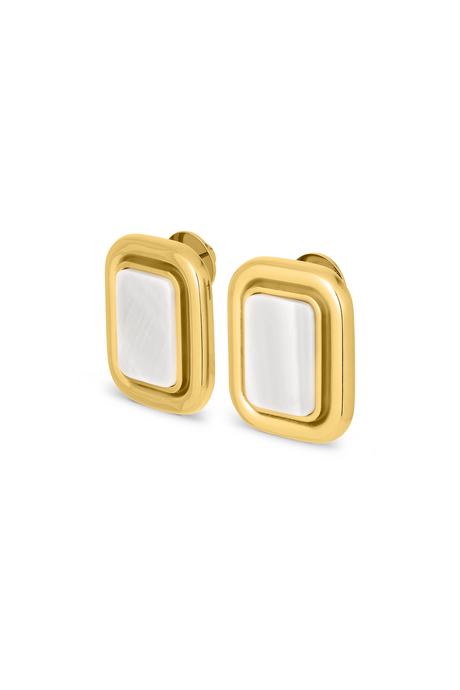 The Leea Earrings feature a glossy white centre framed in 18k Gold plating. Vintage-inspired yet modern, they bring a refined finish to any look.
