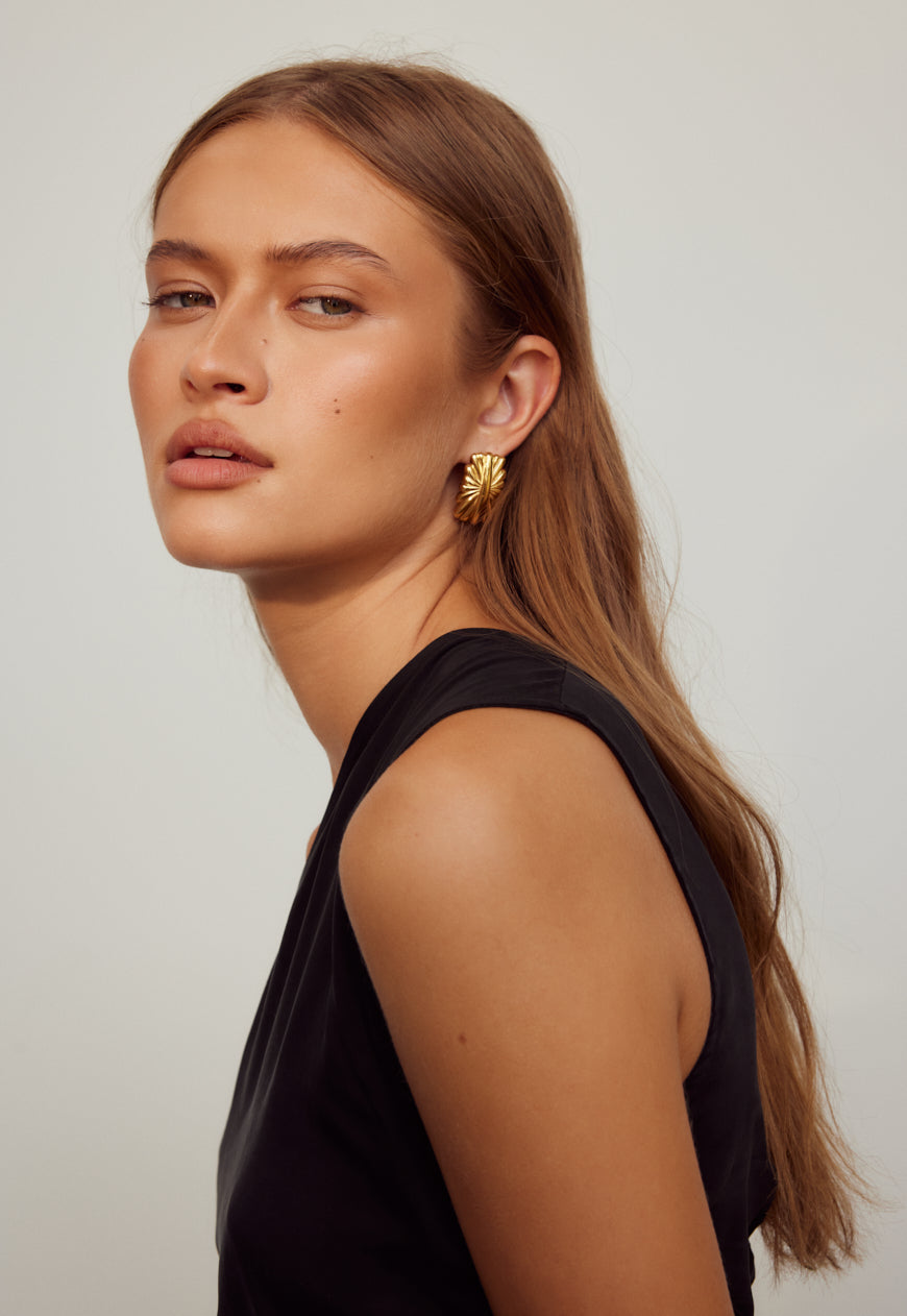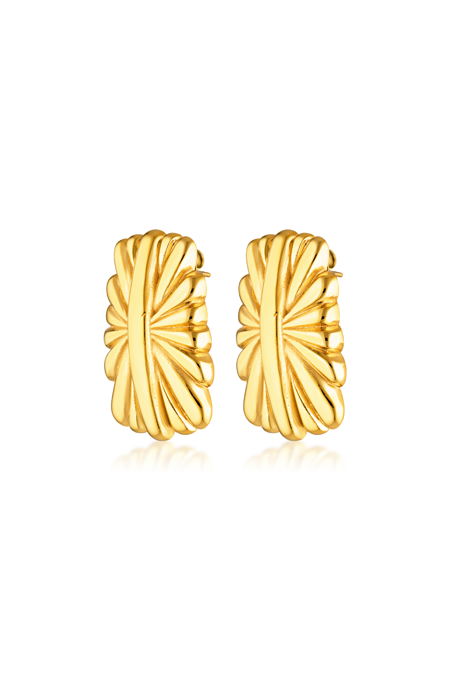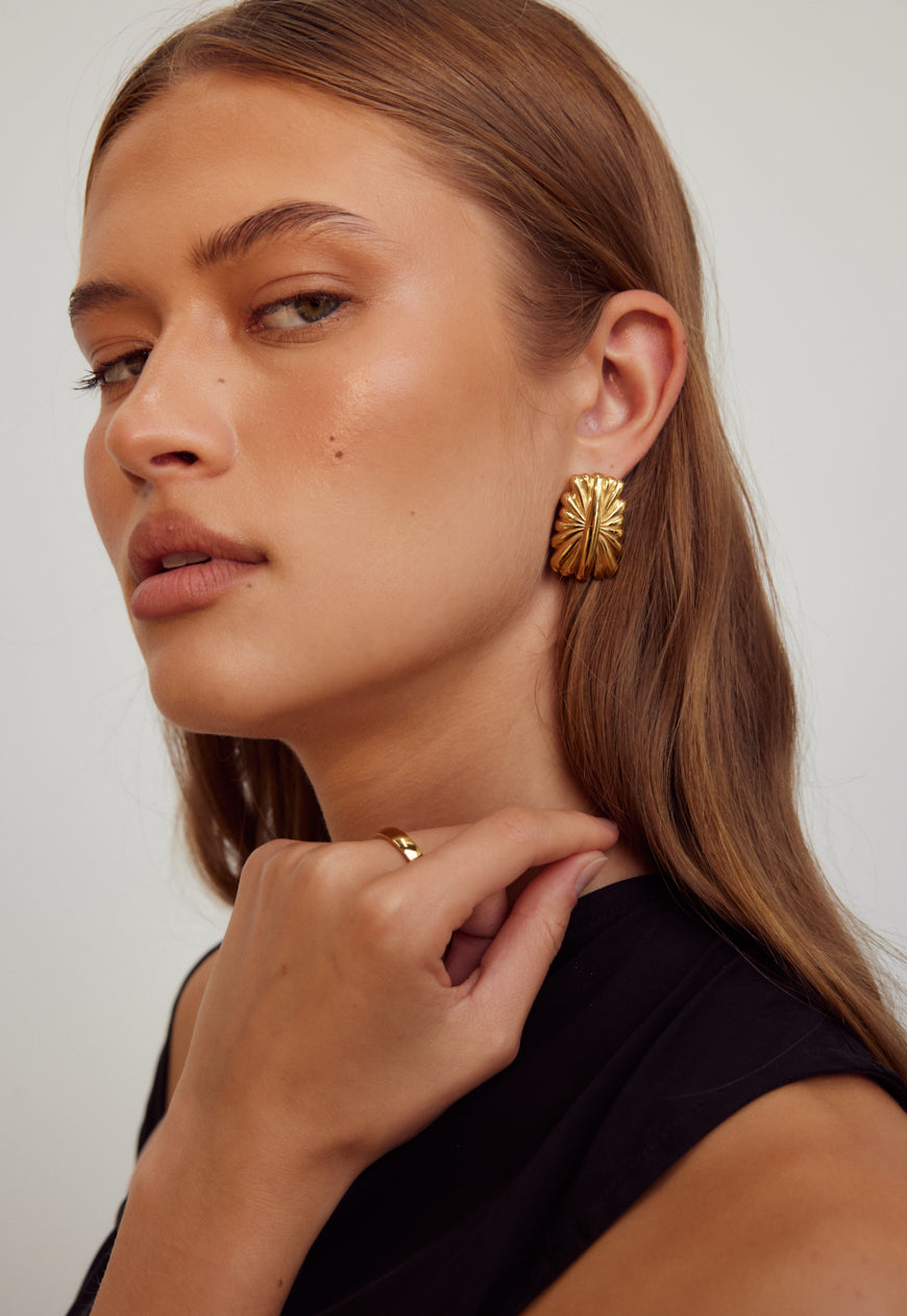 Introducing Lena, a sculpture-inspired style designed to seamlessly transition from day to night. With intricate engravings adorning its rectangular surface, this piece is delicately secured by our custom earring backings for instant lift. Despite its size, Léna is crafted from lightweight 18k gold-plated stainless steel, ensuring both elegance and comfort.