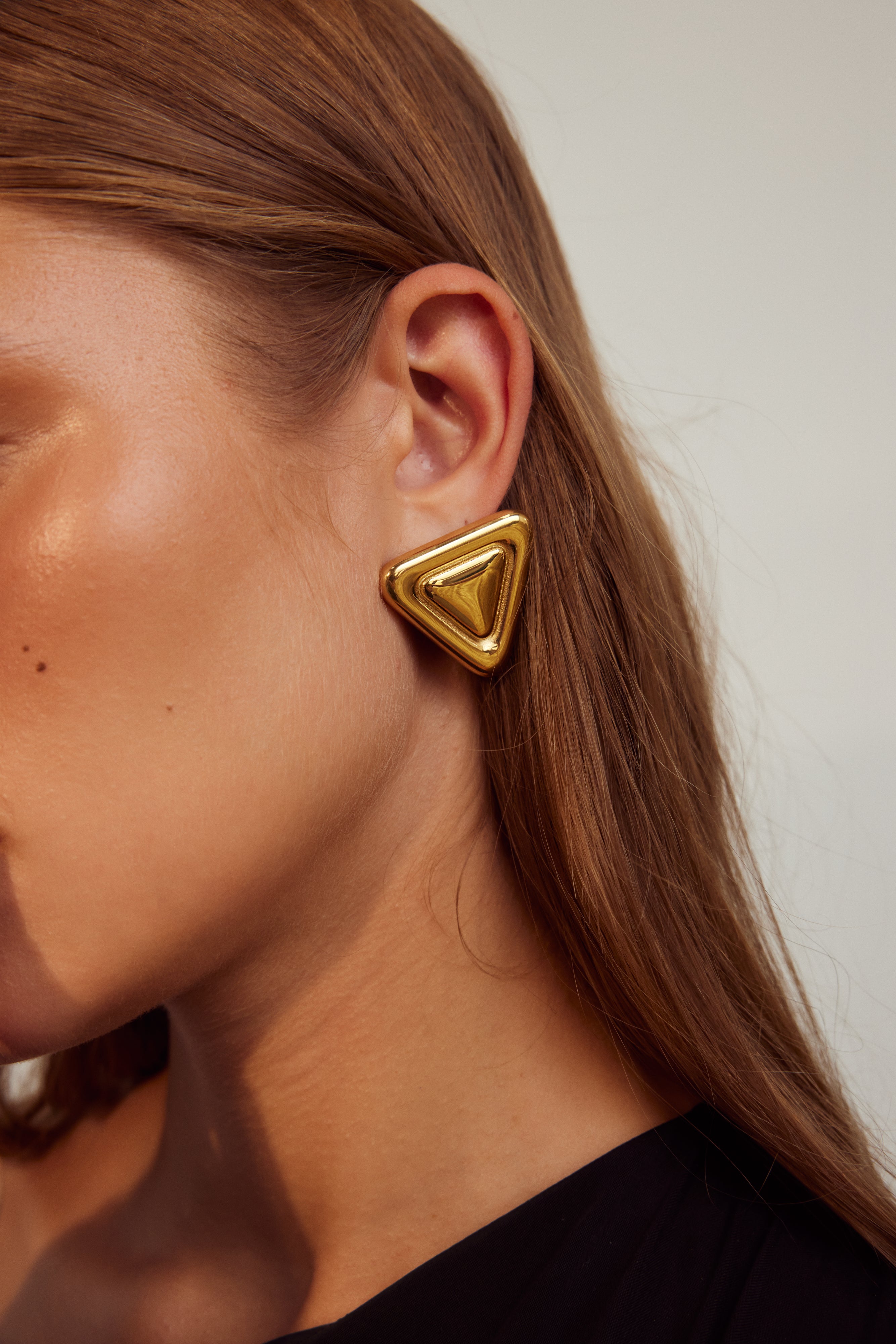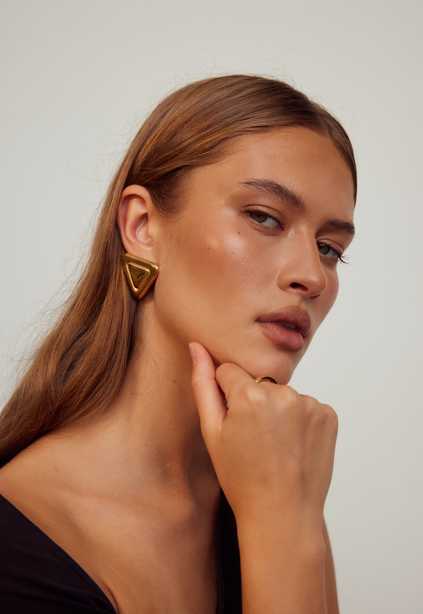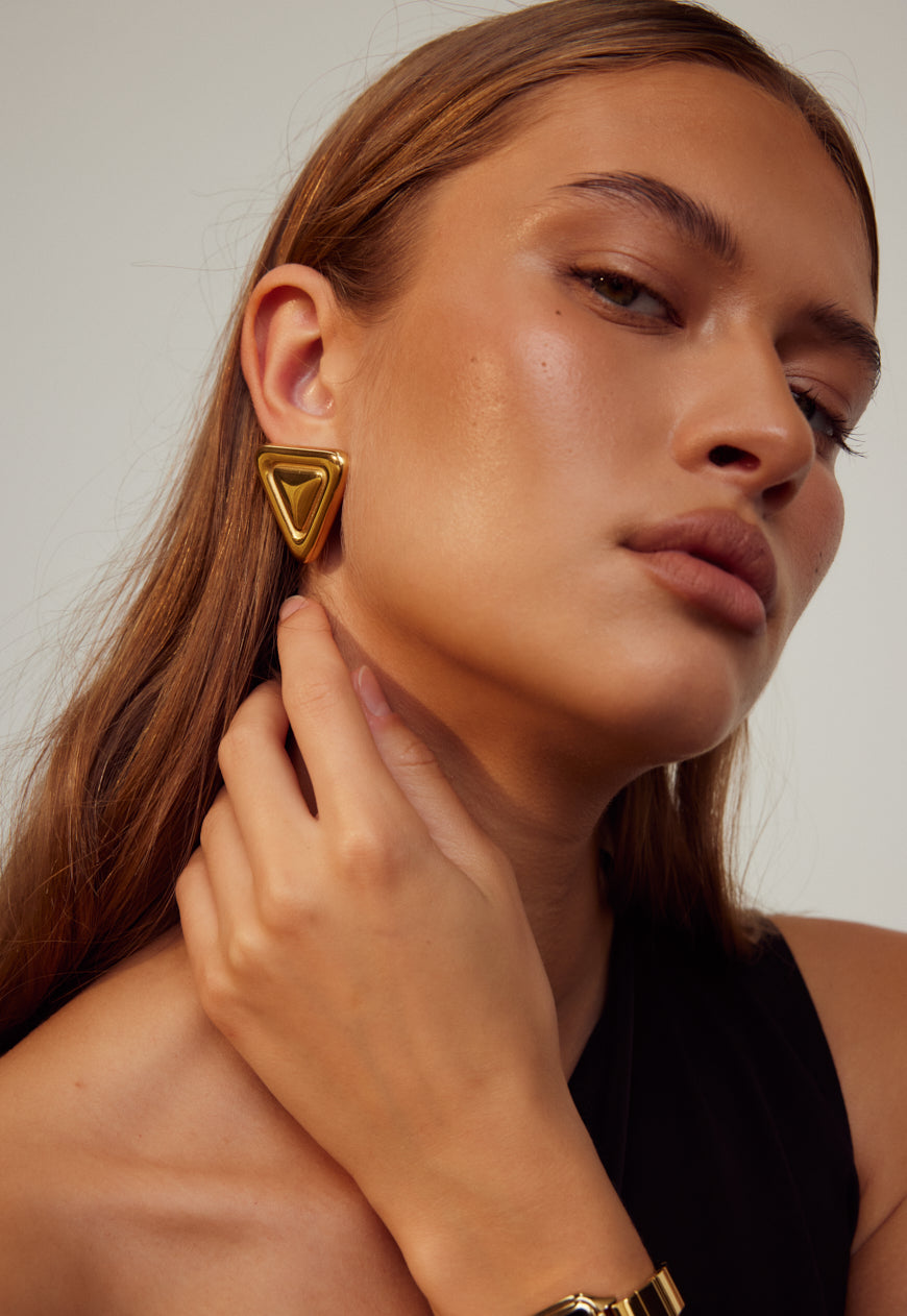 Named after the renowned centre of art in Paris, our Louvre Earrings are destined to be the focal point of your accessories collection. Featuring a distinctive double triangular design crafted from 18k gold-plated stainless steel, this golden style is set to become a staple in your jewellery rotation.