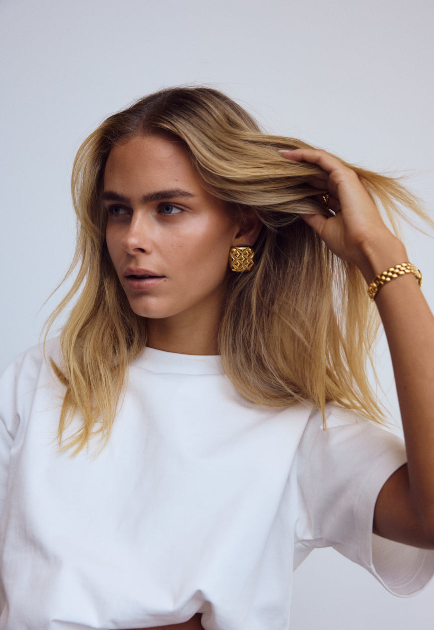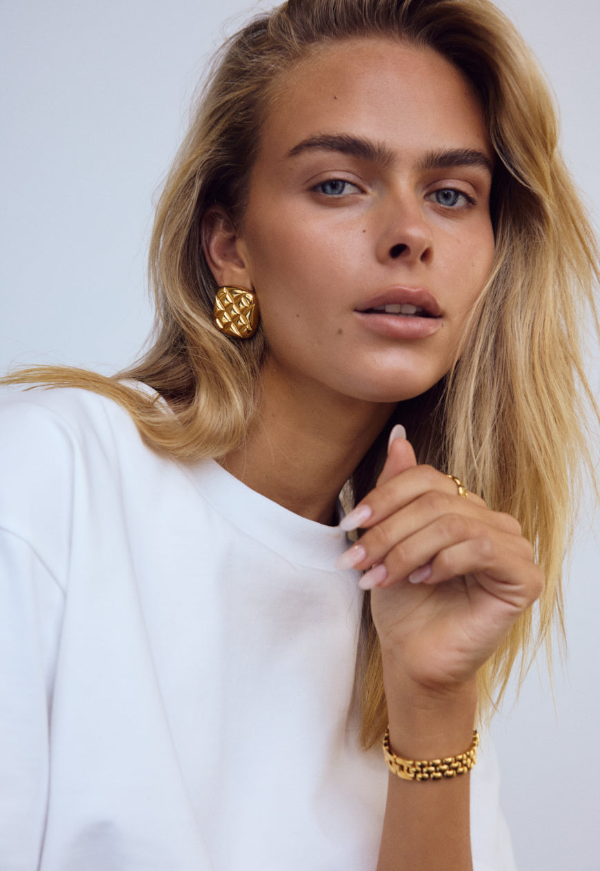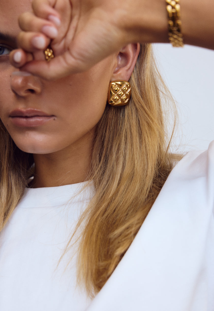 The Olsen Earring has been curated meticulously with effortless sophistication in mind. Debossed with symmetrical line detailing on a curvature silhouette bringing forth an essence of vintage allure. Crafted with 18k Premium Gold Plating On Stainless Steel and a high shine finish, the Olsen Earrings are the perfect addition to your statement collection. Also Available In Silver