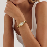 Crafted from 14k premium gold plated stainless steel, featuring an elegant oval watch face, the Phoebe embodies effortless sophistication and timeless appeal.