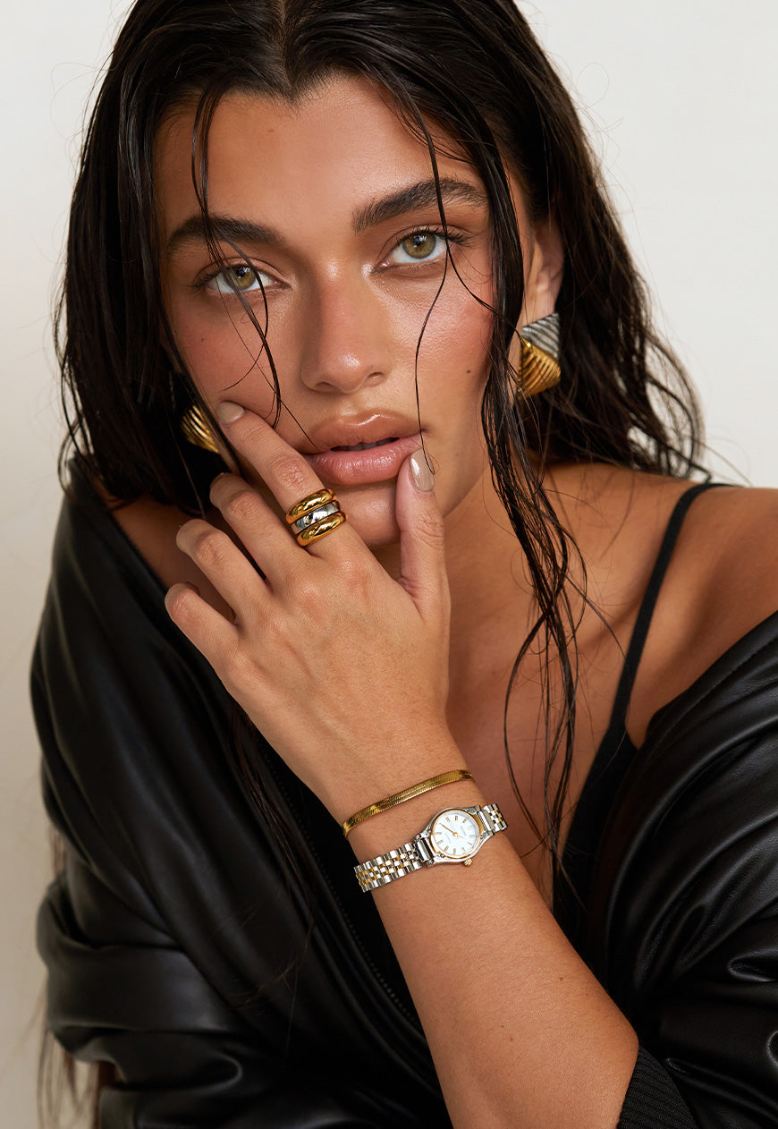 Rich, warm, and softly luminous – our signature gold finish. Designed to make a subtle statement, each piece is plated over high-quality stainless steel for enduring wear.