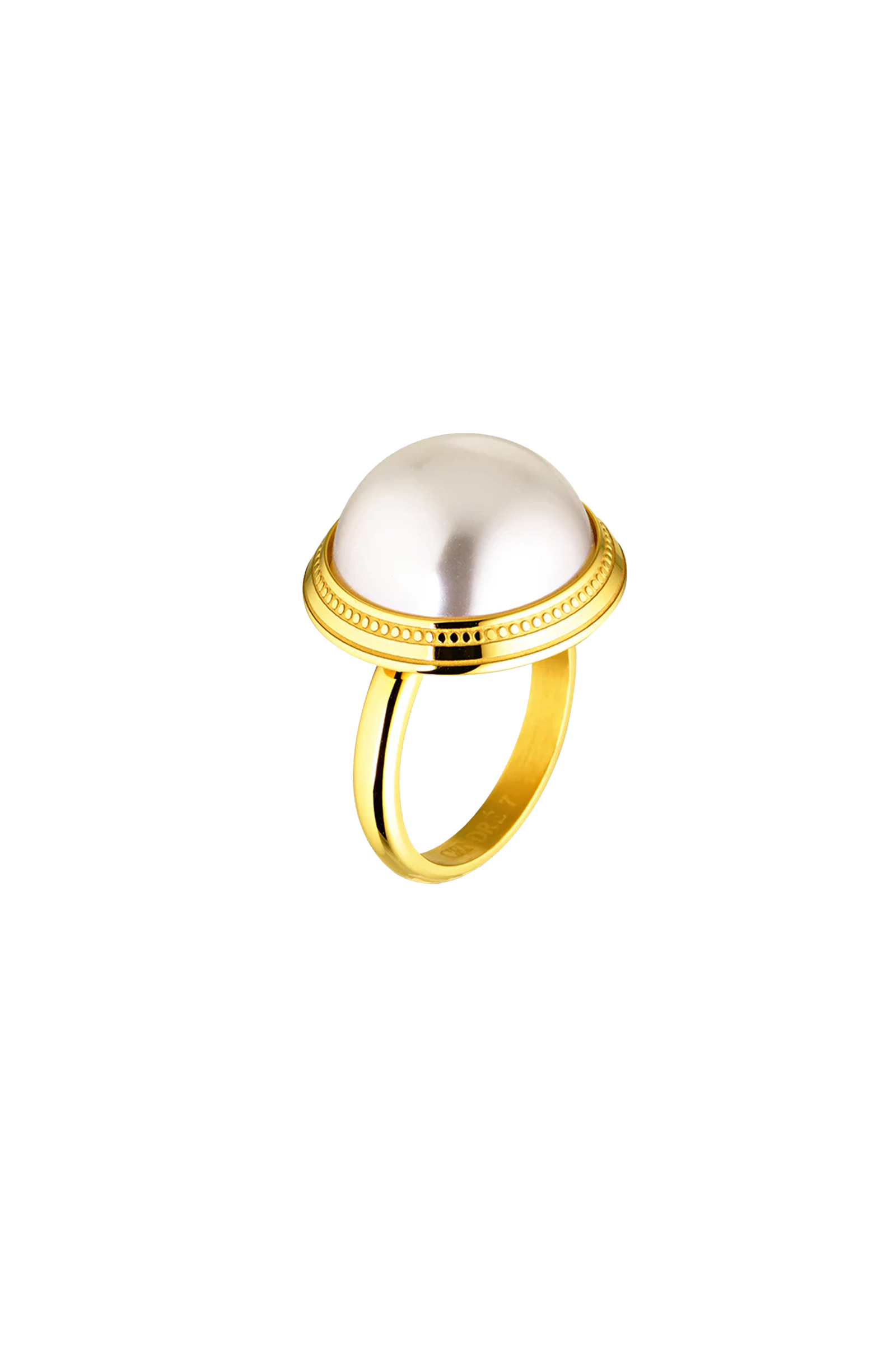 Introducing our Rue Cler Ring—an exquisite vintage-inspired adornment. Nestled within textured 18k gold-plated stainless steel, a lustrous white saltwater pearl takes center stage. The textured gold ring surrounding the pearl adds a touch of sophistication, evoking a romantic style reminiscent of an era when pearls were the must-have accessory.