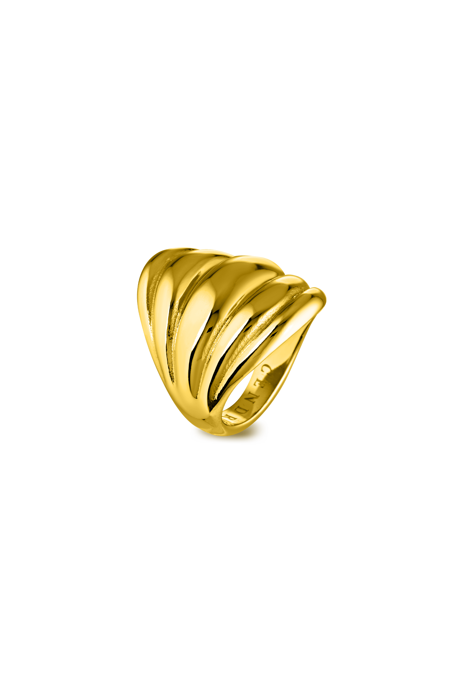 The Santino ring leaves nothing unsaid. It's uncomplicated sculptural essence paired with it's feature size and luxurious 18k gold-plated stainless steel contours, reintroduces a classic style into the forefront of women's styling.