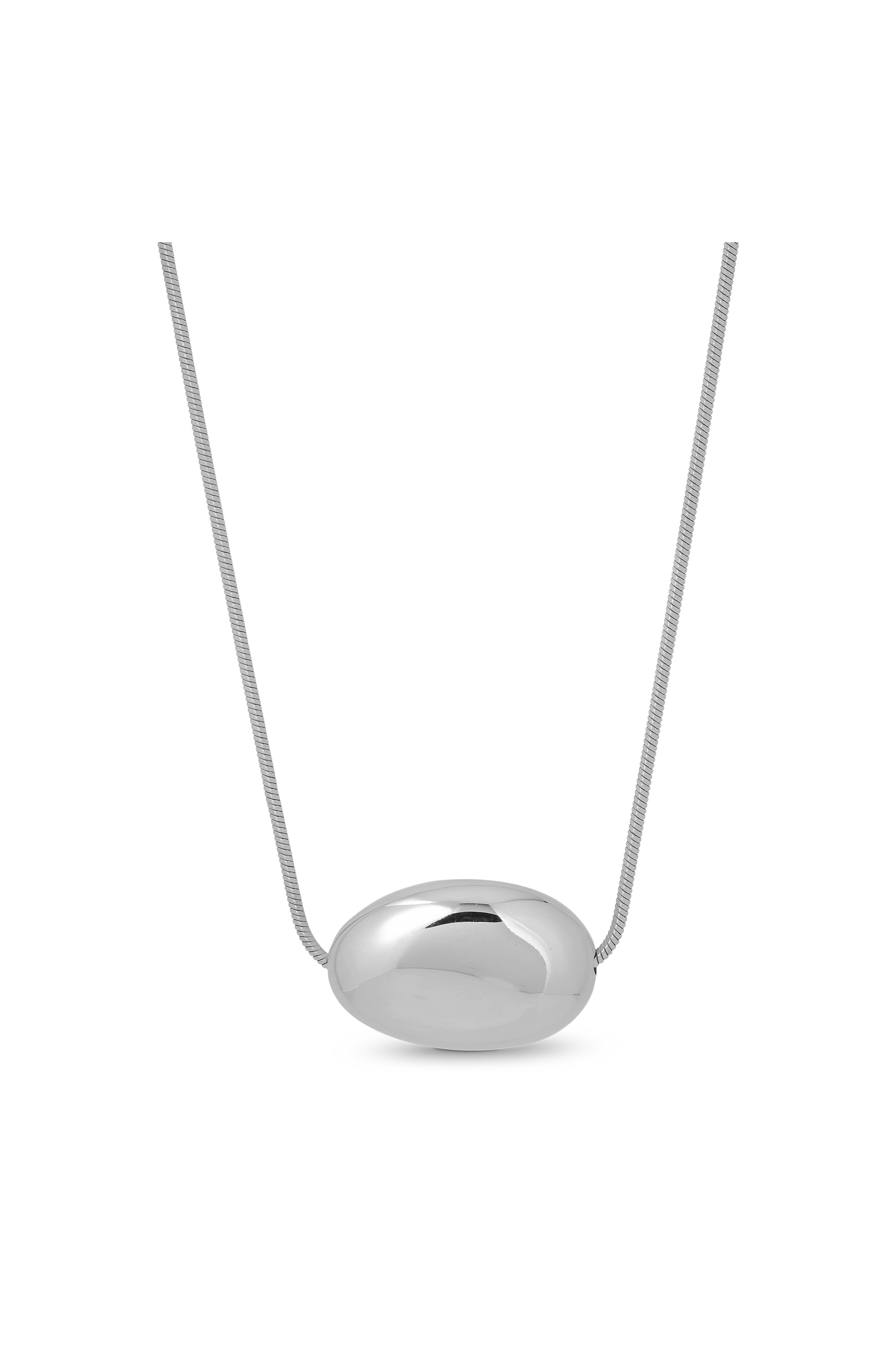 The Sloane Necklace is a rounded, silver polished pendant strung on a delicate chain. A sculptural piece that transitions seamlessly from day to night.