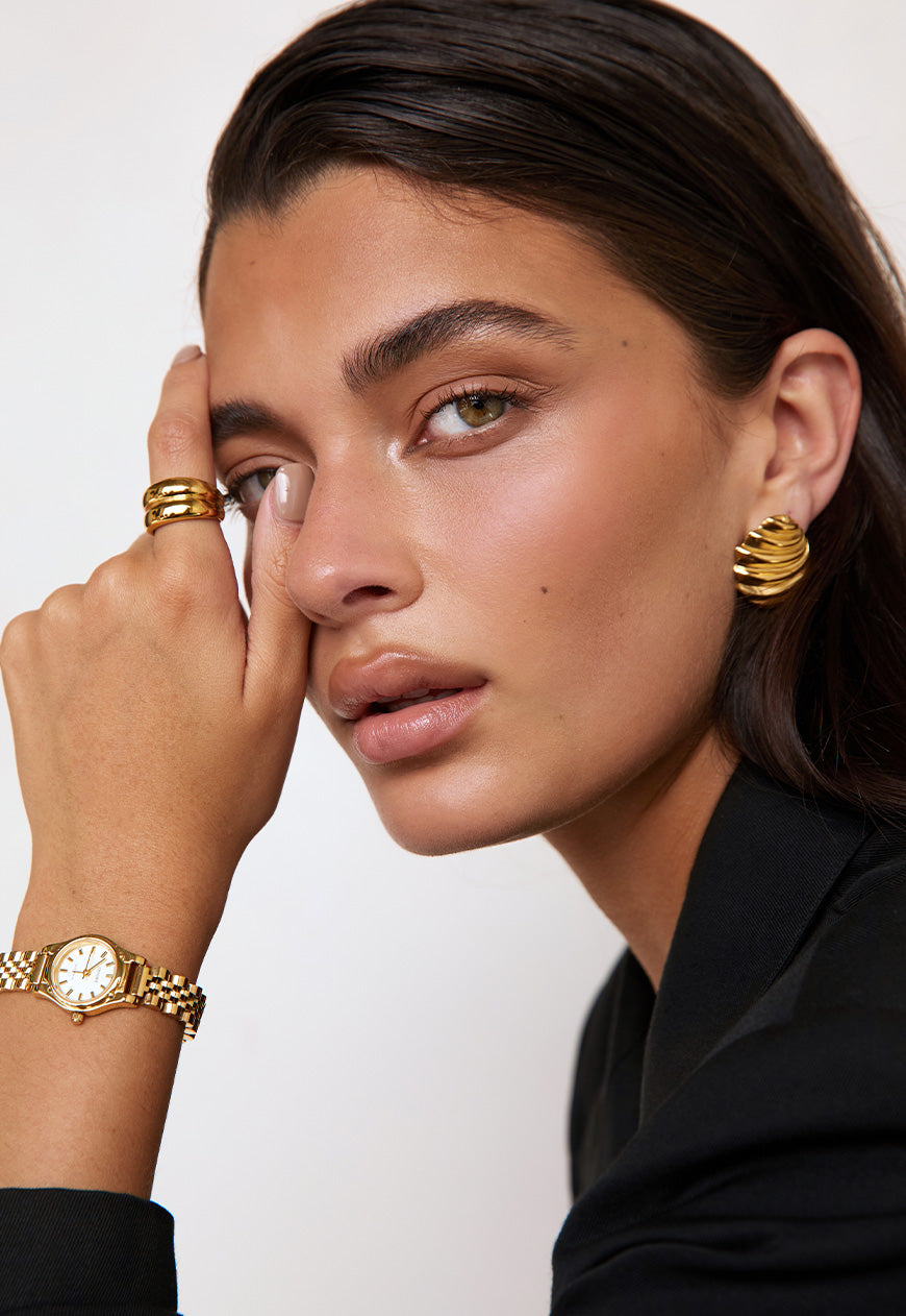 Rich, warm, and softly luminous – our signature gold finish. Designed to make a subtle statement, each piece is plated over high-quality stainless steel for enduring wear.