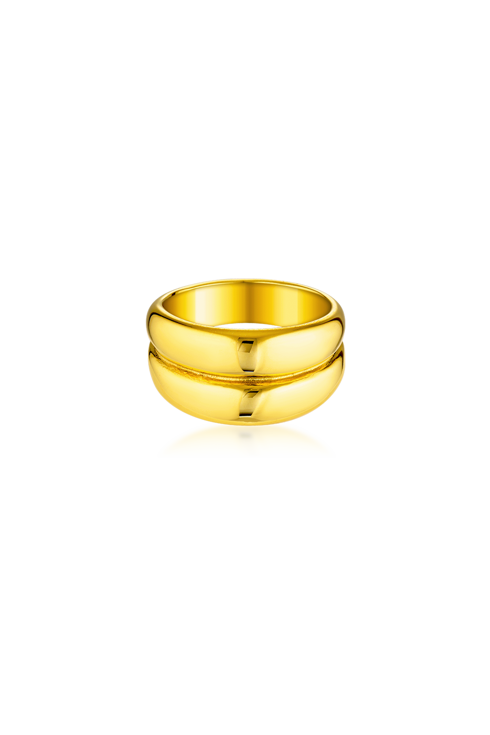 Elevate the style stakes and go double or nothing by slipping on our Sofia Ring, a piece that'll help you master the art of style. This high shine, double stacked ring is crafted in 18k gold plated stainless steel and despite its polished outer, it has a smooth interior. This style is extremely versatile and can be paired with anything.