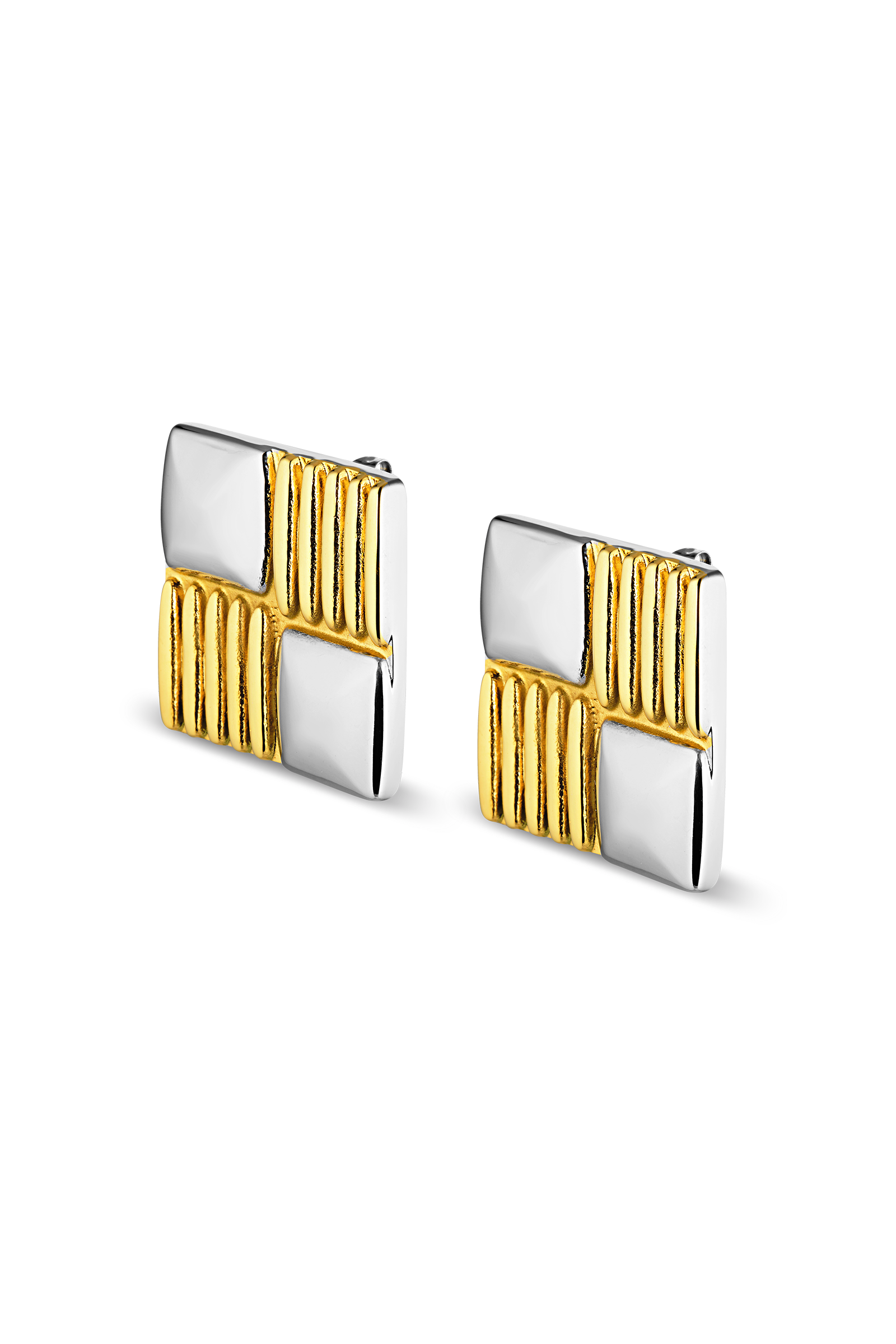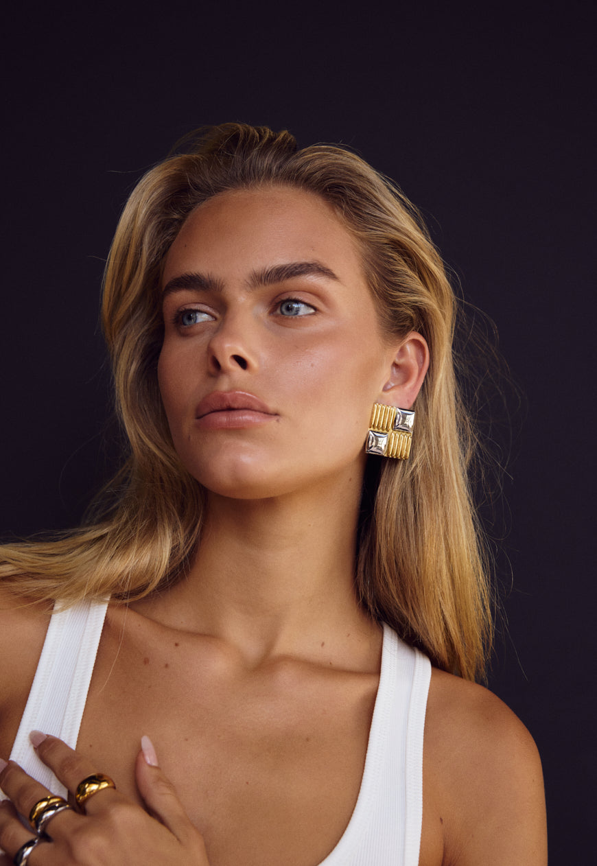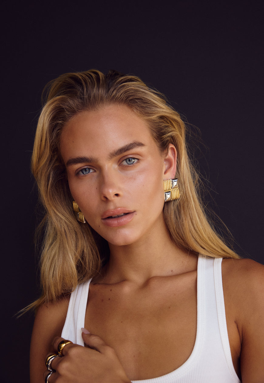 The Valentina Earrings are here to bring a sophisticated moment to your statement rotation. Bringing together mixed metals, the Valentina feature a four cubed design with high shine polished surface and line engraving, providing an artistically symmetrical detail on an oversized silhouette. Crafted with 18k Premium gold plating on stainless steel and secured with our custom earring backings providing an instant lift and easy to wear style.