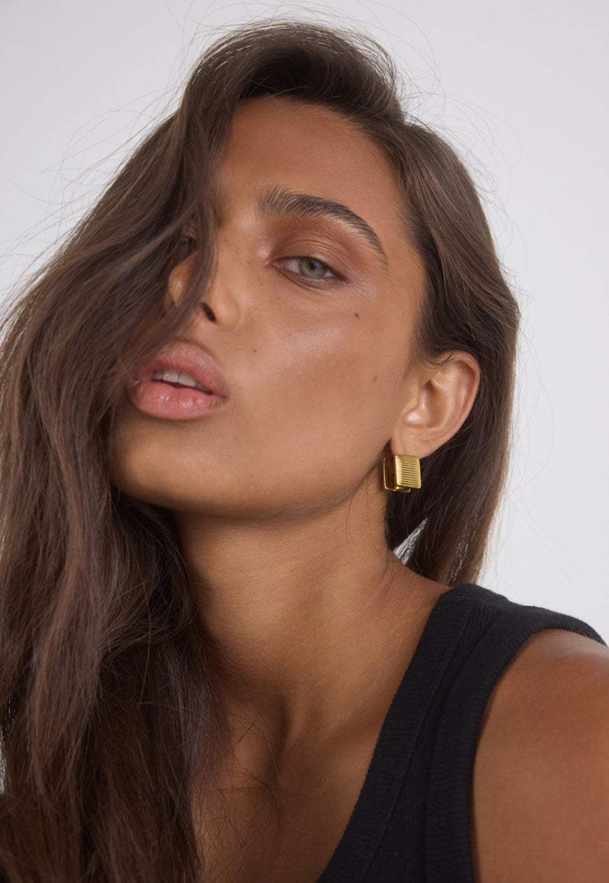 Meet the Willia Huggie, a simplified staple featuring a semi-curved square silhouette with horizontal fine line engraving providing an elevated finish. With it’s easy click through huggie design, the Willia have been crafted with 18k Premium Gold Plating on Stainless Steel makes this piece the perfect staple to compliment any ensemble.