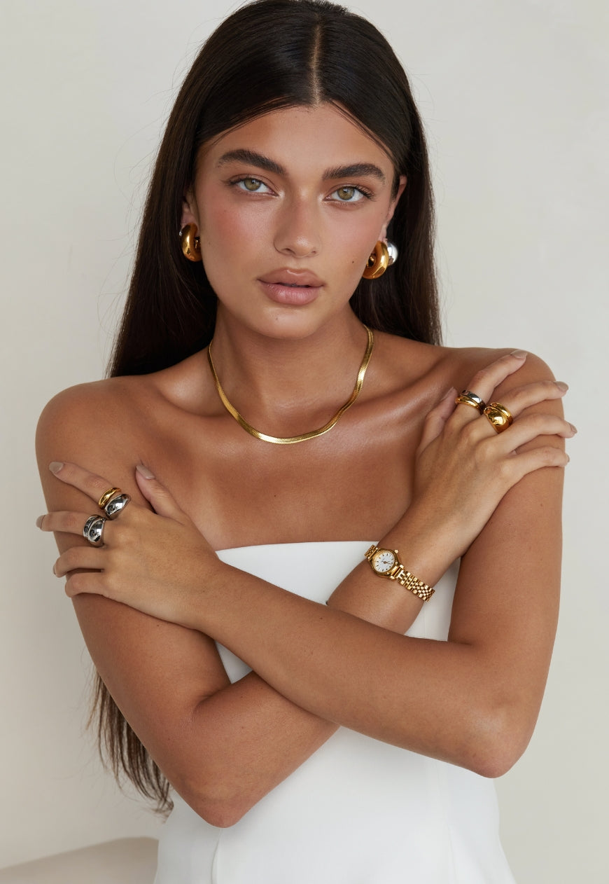 Rich, warm, and softly luminous – our signature gold finish. Designed to make a subtle statement, each piece is plated over high-quality stainless steel for enduring wear.
