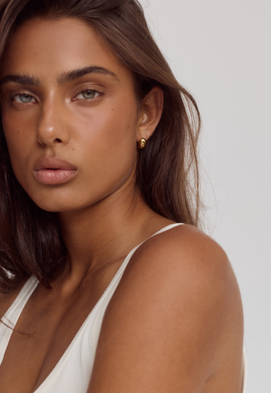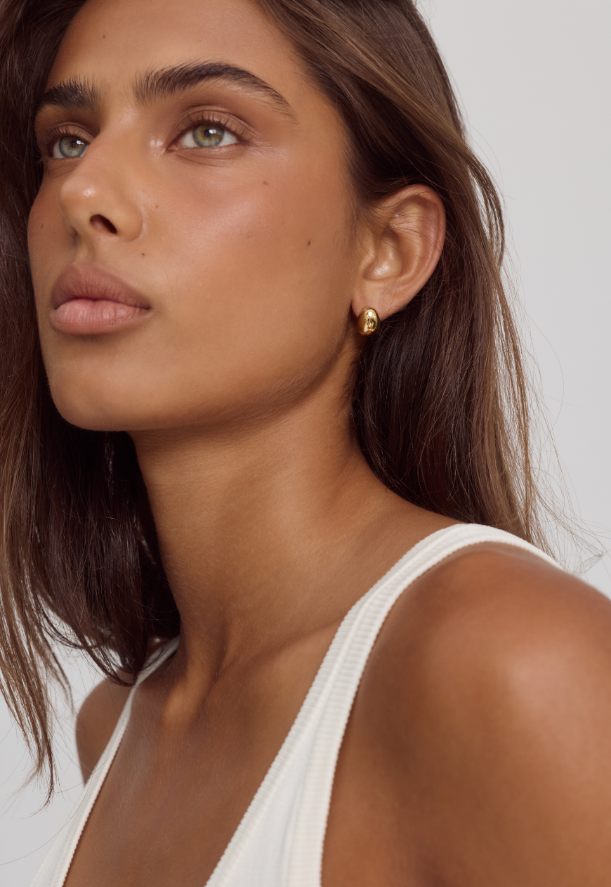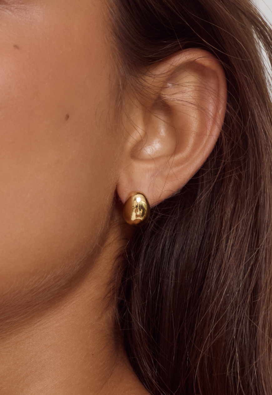 The Bean Earrings feature a smooth bean-like silhouette. Crafted with 14k Premium Gold Plating on Stainless Steel, their petite and delicate form makes them a subtle statement, perfect for everyday wear.