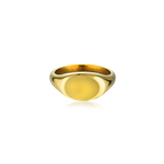 The Zuri Ring is a signet style ring that has a flat oval surface and is made from 18k gold plated steel can be worn on pinkie if purchased in a smaller size.