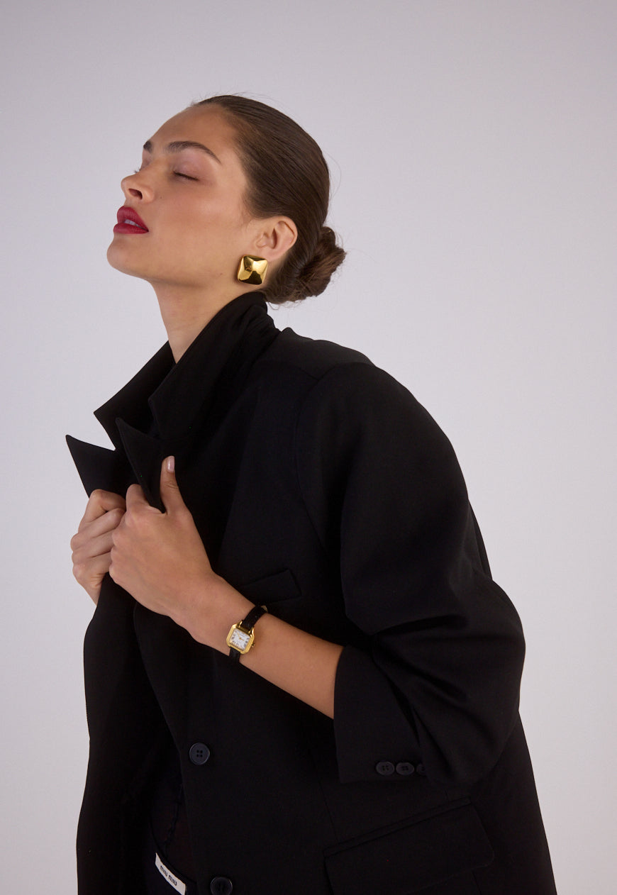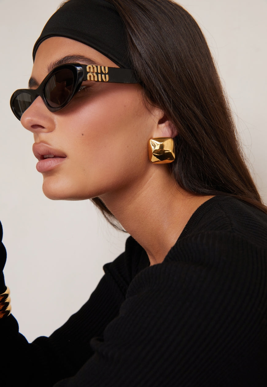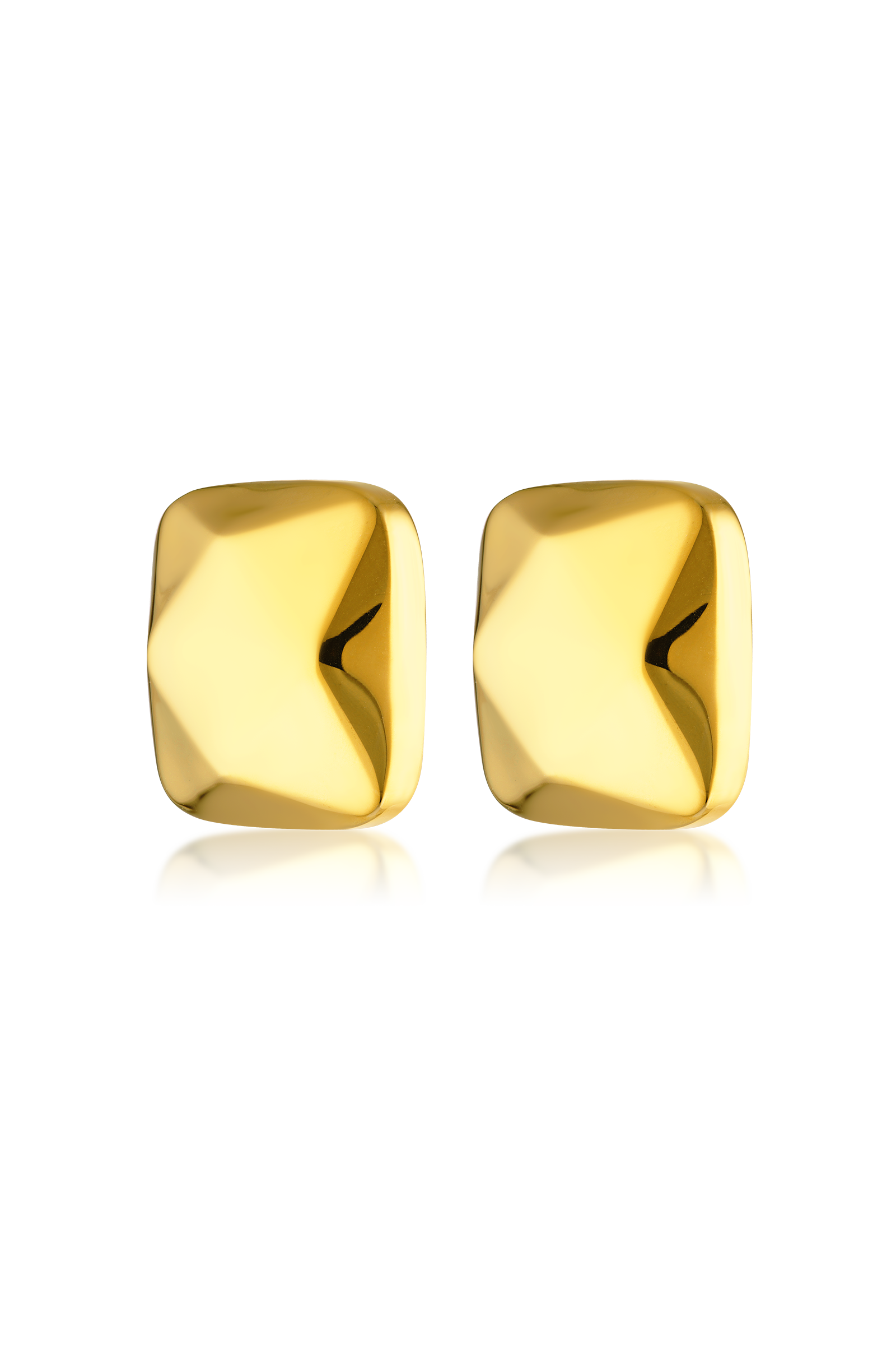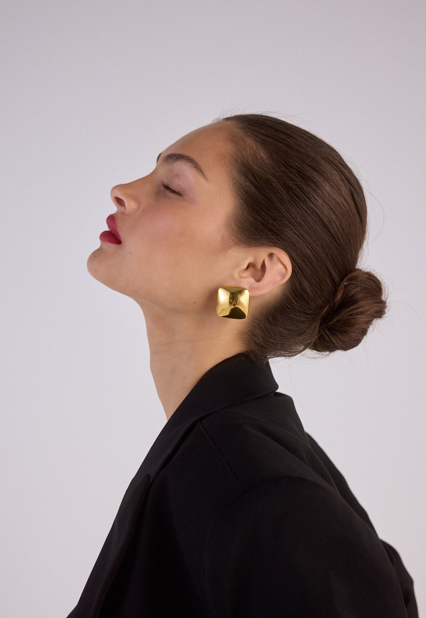 shapes, presenting a captivating interplay of forms. Crafted from 18k gold-plated stainless steel, these earrings are elegantly secured by our custom instant-lift earring backings and exhibit a trompe effect, adding an intriguing visual dimension to their design.