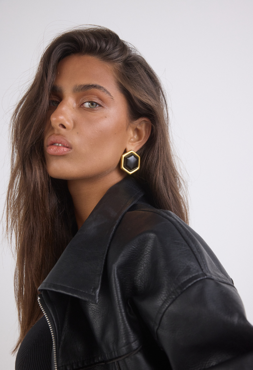 The Muse Earrings are bringing forth an effortless nod to the quintessential seventies era with their vibrant showcase of mixed tones, high shine monochromatic detailing and perfectly presented on a symmetrical hexagonal silhouette. Crafted with 18k Premium Gold Plating On Stainless Steel, the Muse earrings are primed to enhance your statement collection.