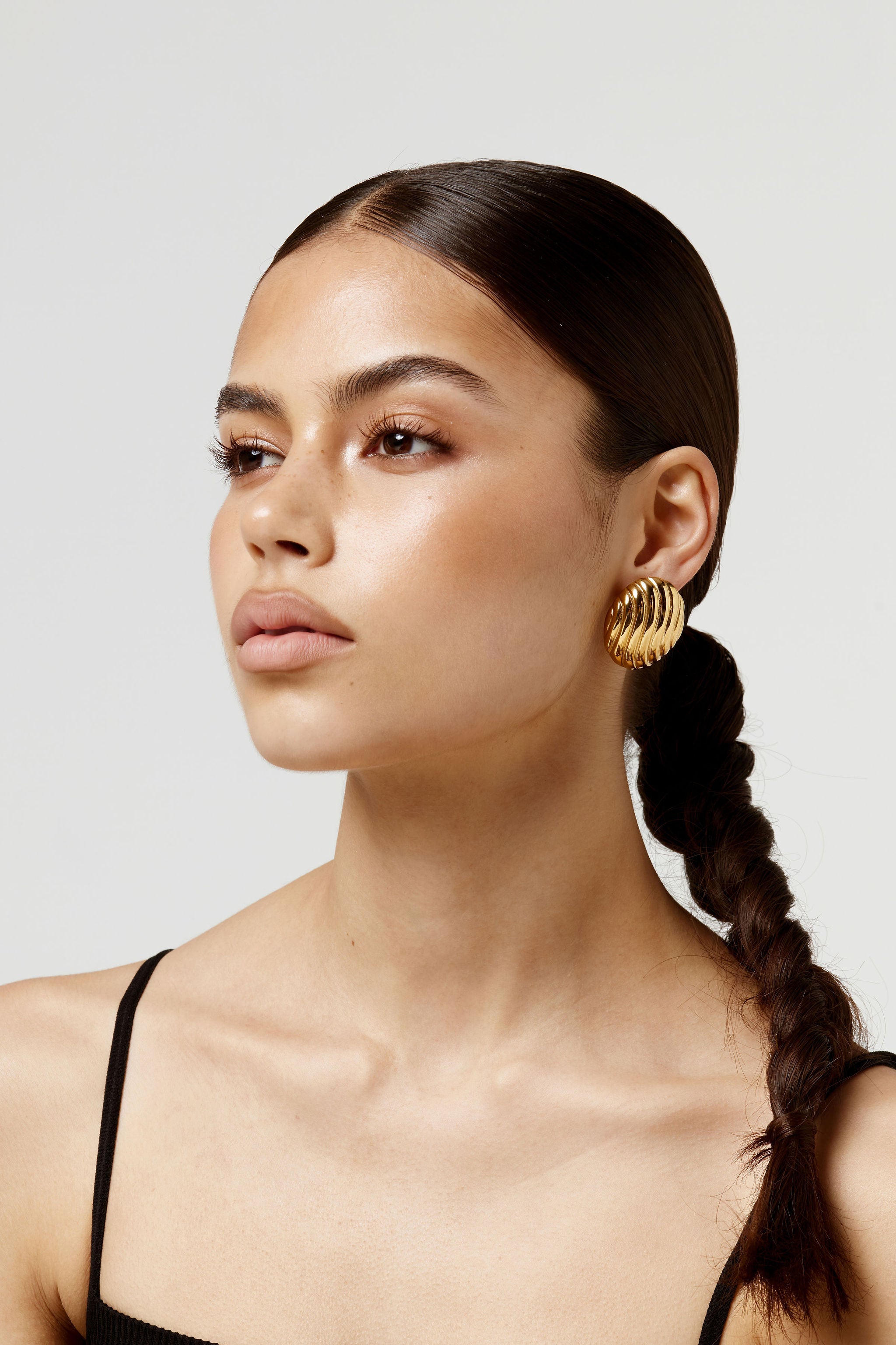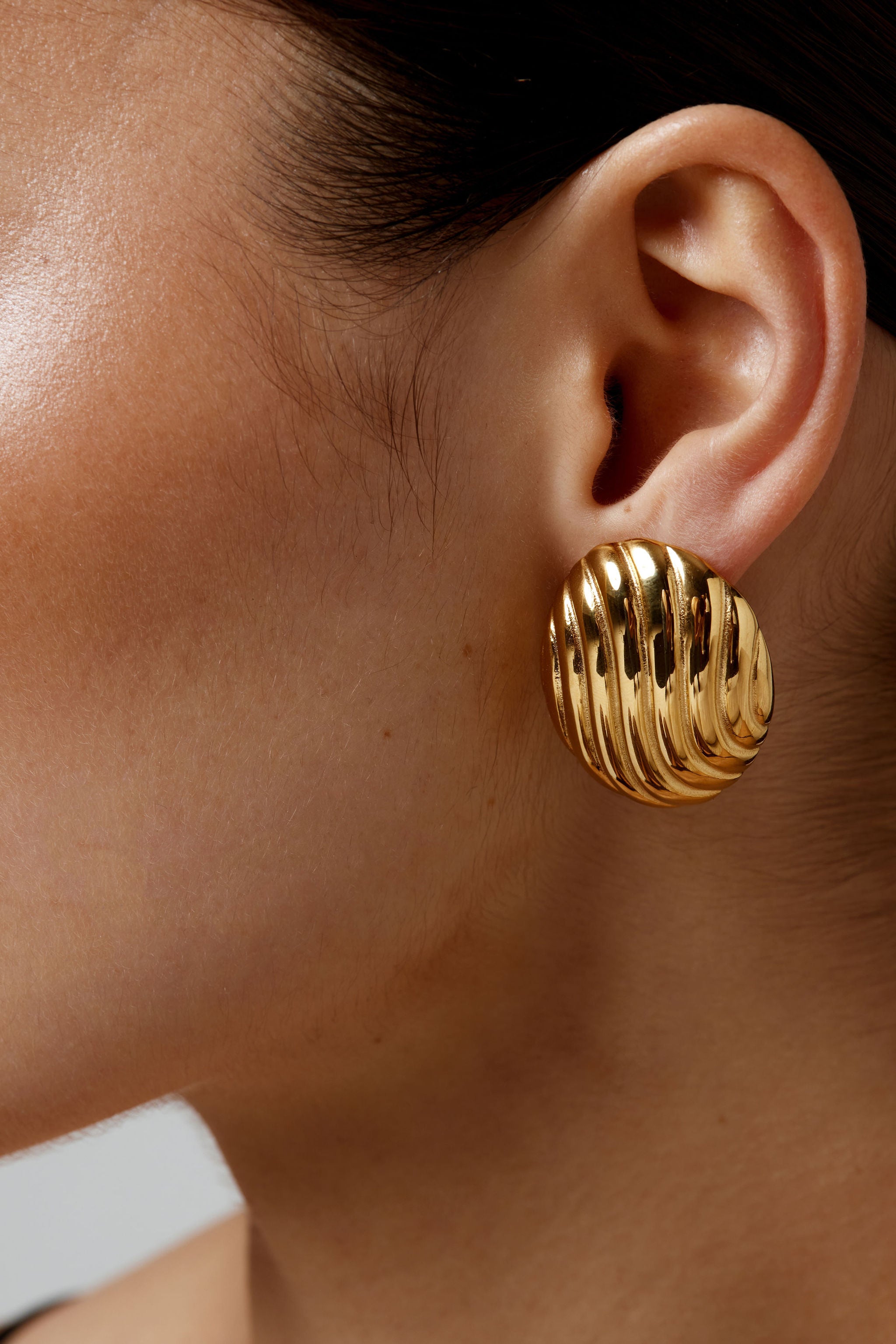 Promising to leave a lasting impression, the Odette Earrings are a playful style that celebrates intricate details. Crafted from 18k Premium Gold Plating on stainless steel, these earrings feature curved, wave-like engravings on the surface, providing a captivating visual appeal.