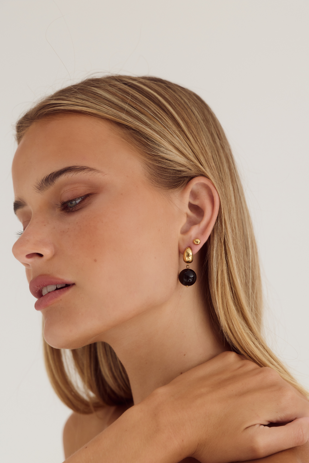 The Gia Earrings feature a rounded, organic curve. Crafted from 18k premium gold-plated stainless steel, their sculptural form sits close to the ear, offering a modern, understated accent that layers effortlessly with other pieces like the Bean Earrings.