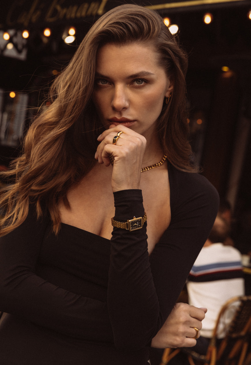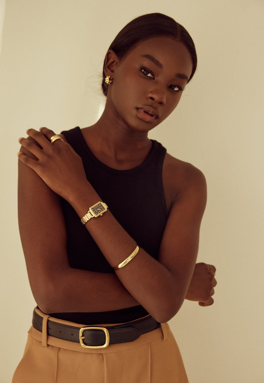 Allow us to introduce you to the Mason Watch, a timepiece that combines form and function. It’s crafted from 18k gold plated stainless steel and has an engineer band with a polished finish. Embrace the moody allure of this style in black and pair it with dark neutrals for a look imbued with classic Parisian flair.