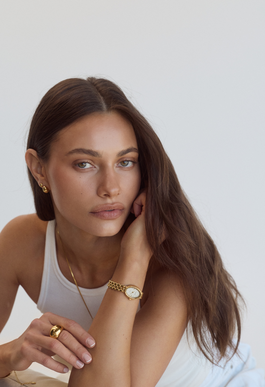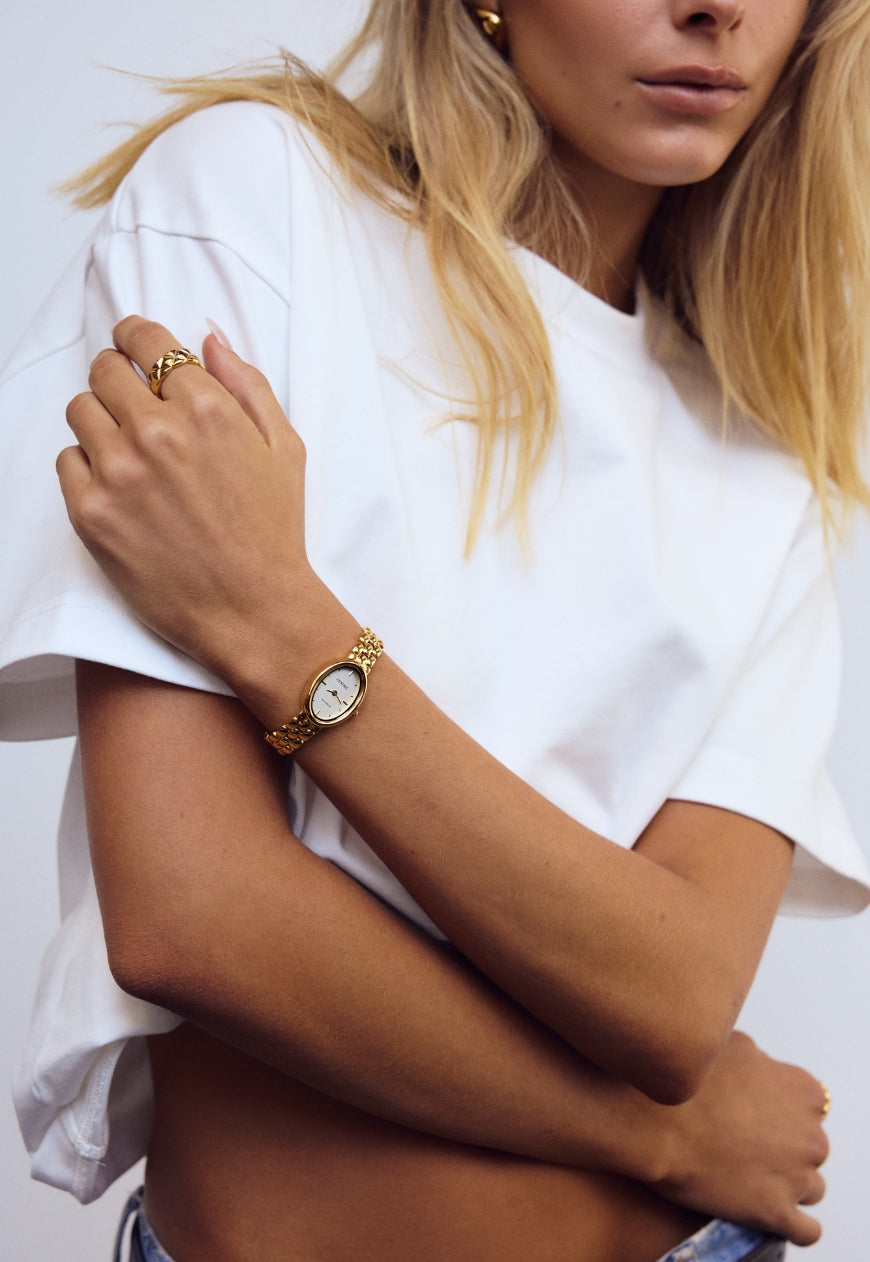 Indulge in our number one best selling Phoebe watch - a staple poised with a feminine silhouette, modern charm & practicality for the everyday. Ready to fit graciously into your adornment rotation, the Phoebe - Gold has been built on 18k Premium double gold plated stainless steel and features a white, oval faced imprinted with our signature brand-mark and adjustable strap to personalise your fit.