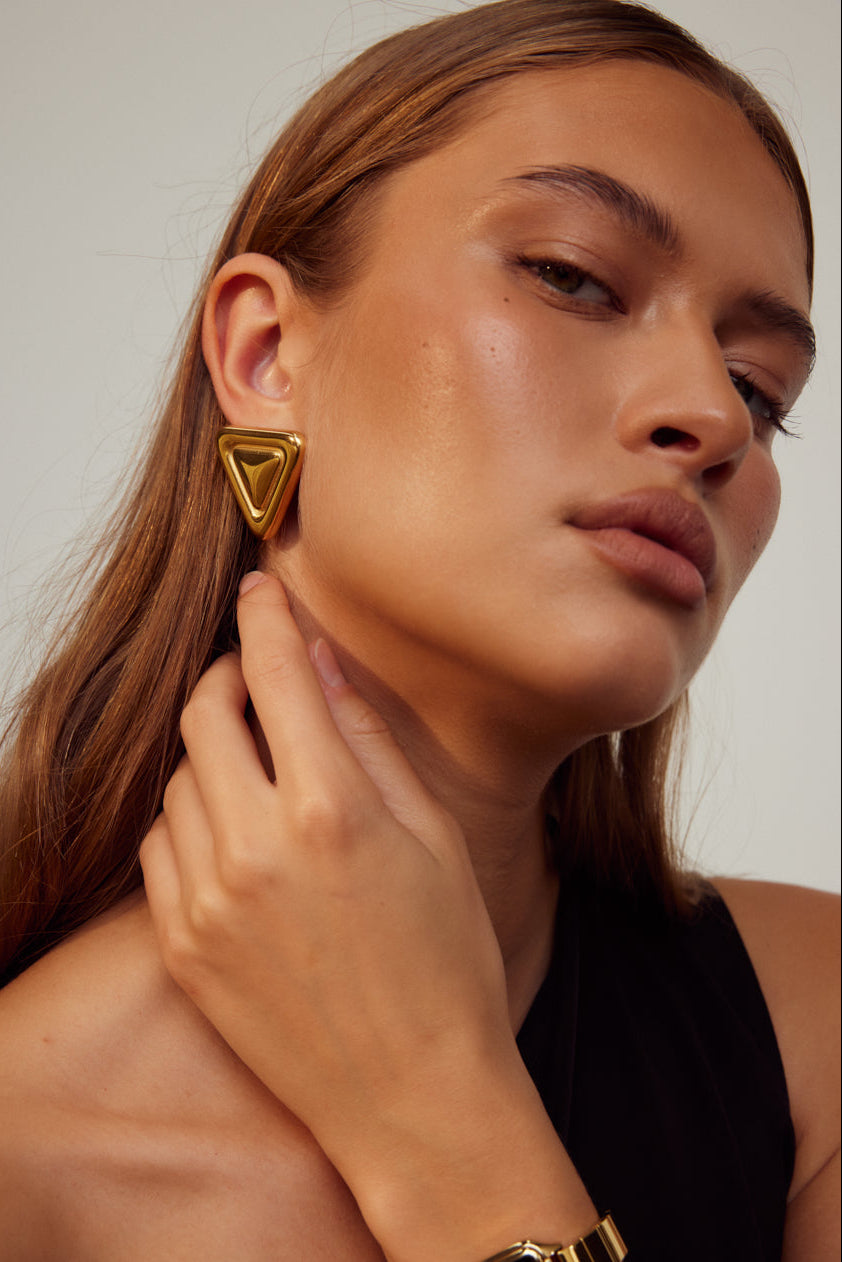 Named after the renowned centre of art in Paris, our Louvre Earrings are destined to be the focal point of your accessories collection. Featuring a distinctive double triangular design crafted from 18k gold plated stainless steel, this style is set to become a staple in your jewellery rotation.