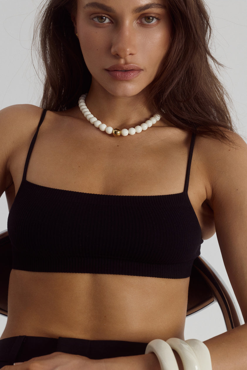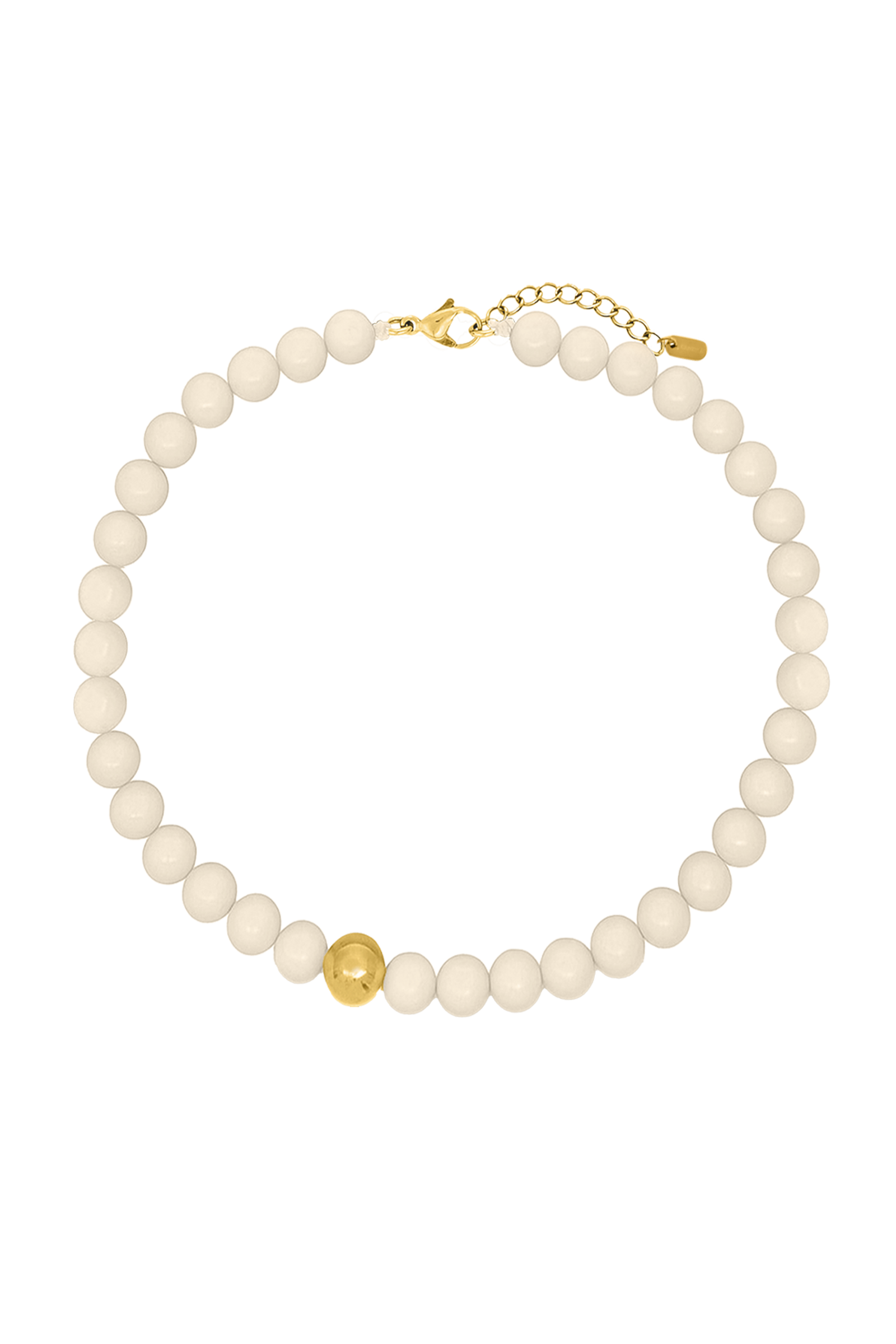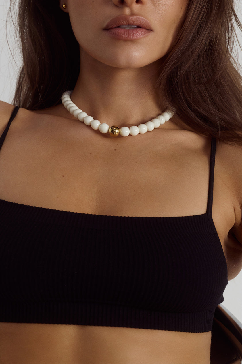 Balancing structure and softness, the Prudence Necklace features smooth vanilla-toned resin beads centred by a single 18k gold plated sphere.