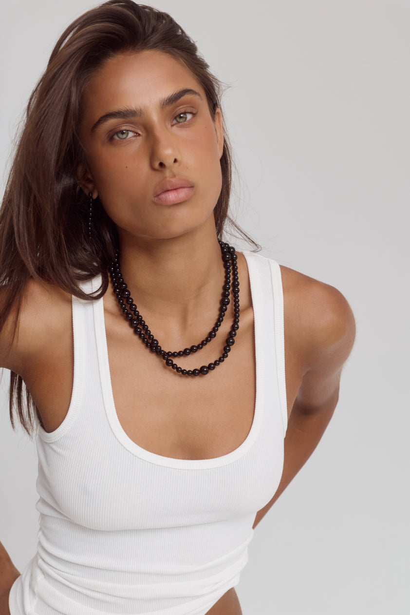 The Serphina Necklace features glossy black agate beads strung in a fluid, elongated silhouette. Designed to be worn long or doubled, its sculptural form offers versatile styling from day to night.