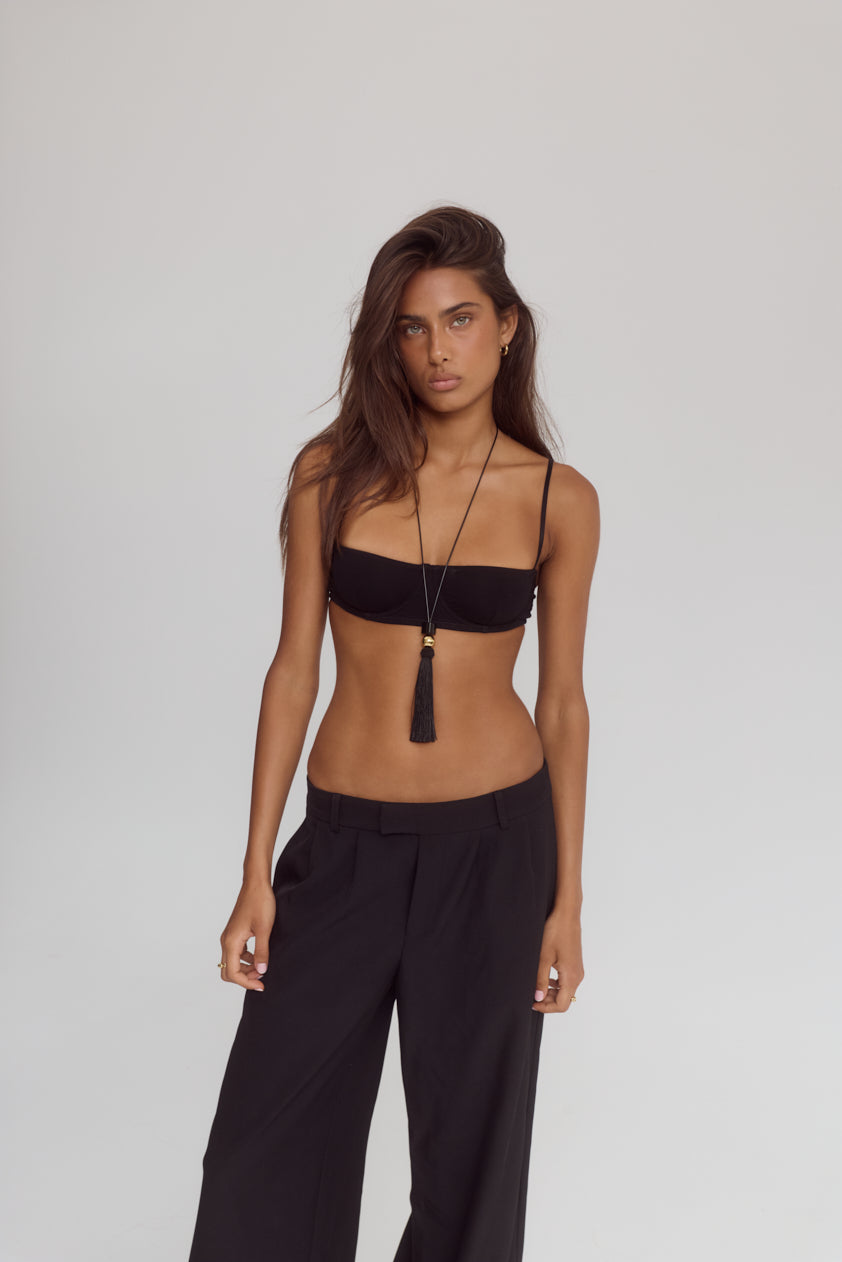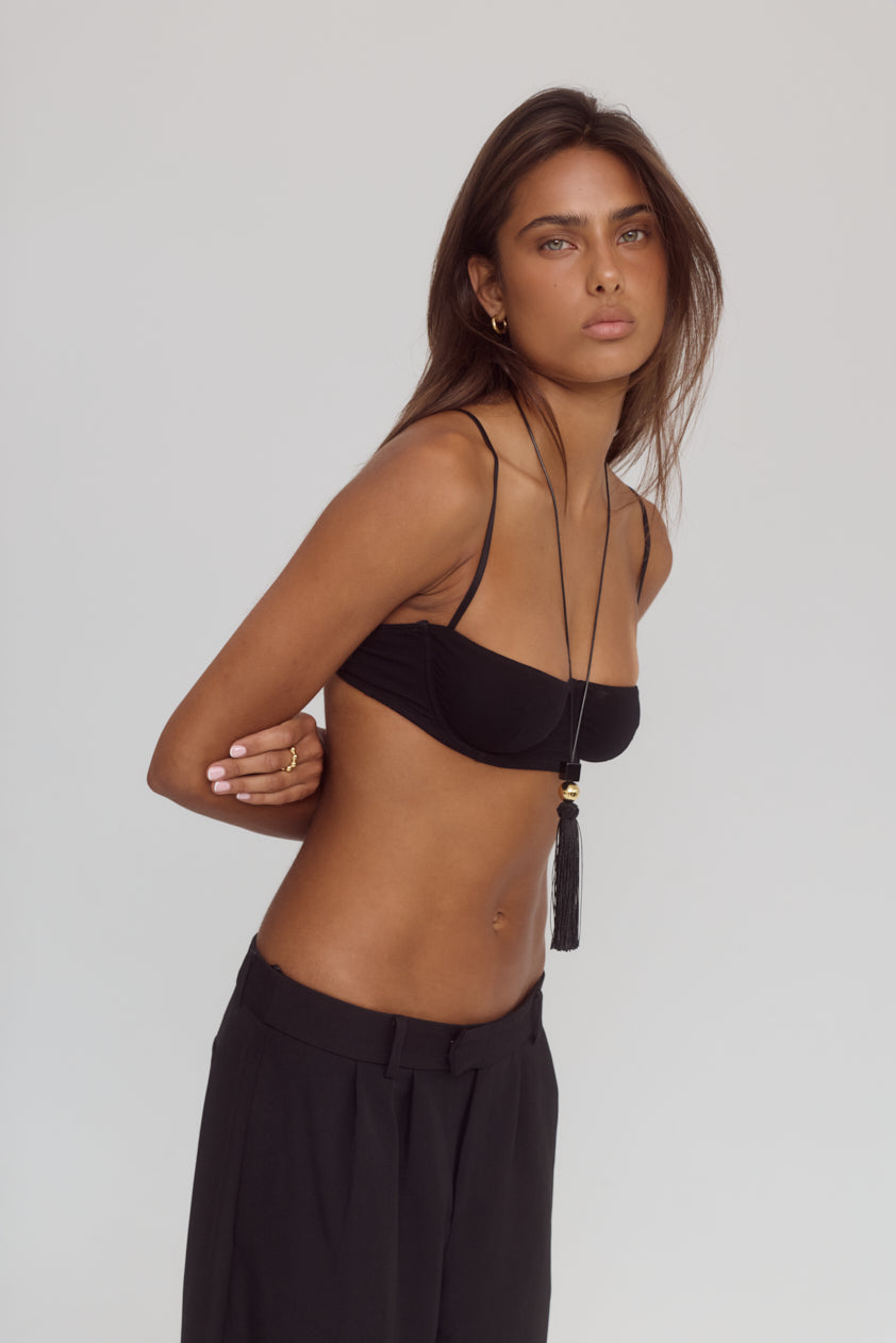 The Winona Necklace features a long black cord finished with a sculptural tassel drop and 18k gold-plated stainless steel sphere pendant. Its fluid silhouette and elongated form create a refined statement with effortless edge.