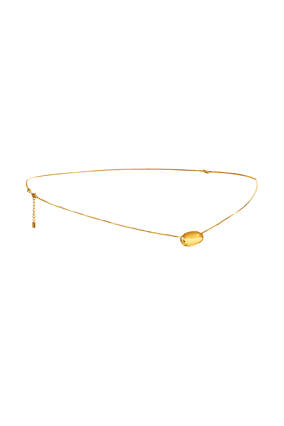 The Sloane Belt features a rounded, 18k Gold polished pendant strung on a delicate chain. Designed to be worn at the waist or adjusted into the Sloane Necklace, this versatile piece transitions seamlessly from day to night.