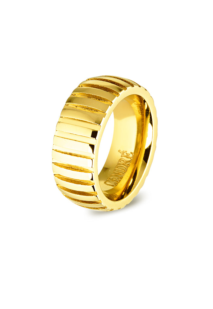 The Harper Ring in Gold is a premium ribbed cigar ring expertly crafted with 18K gold plating on stainless steel. Enjoy the benefits of durability and a luxurious design, perfect for adding a touch of sophistication to any outfit. Made to last with a professional finish, this ring is a must-have for any jewellery collection.