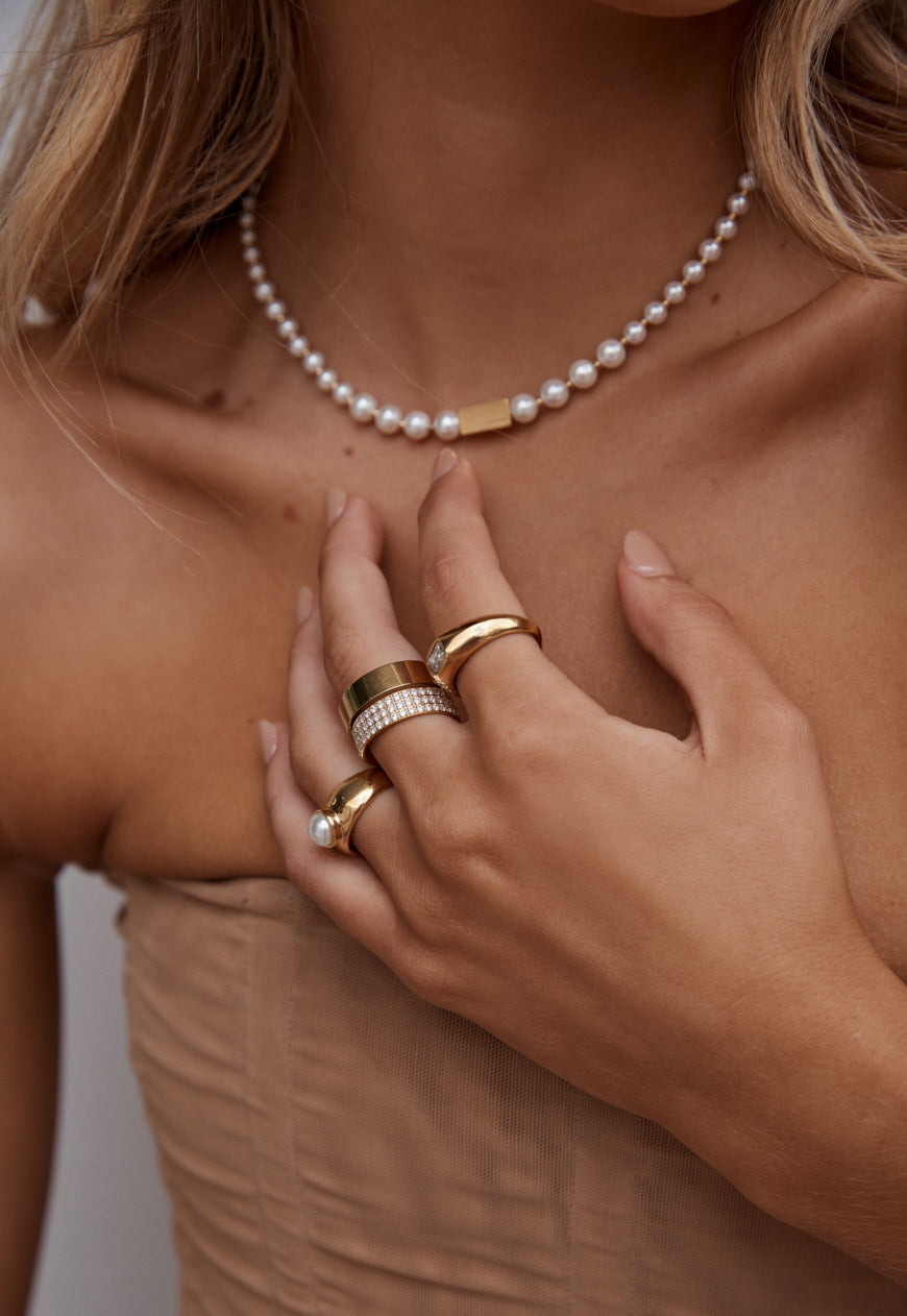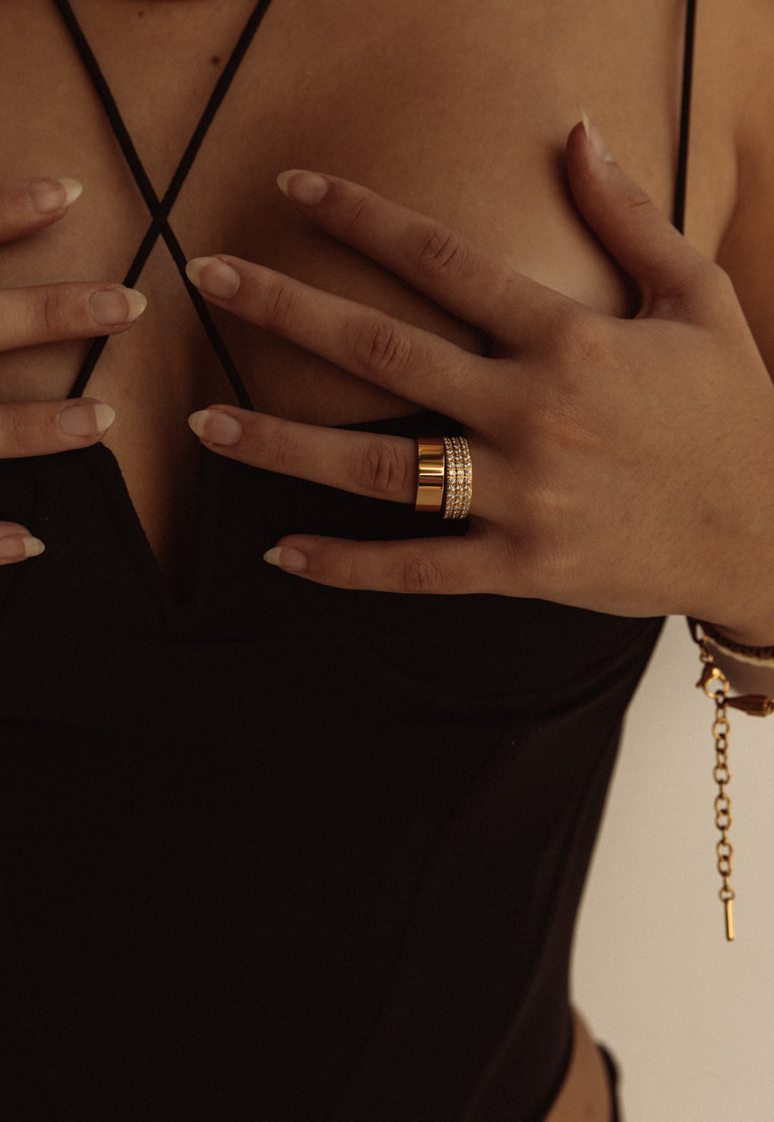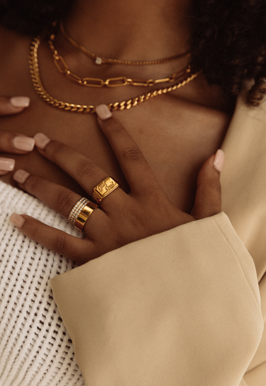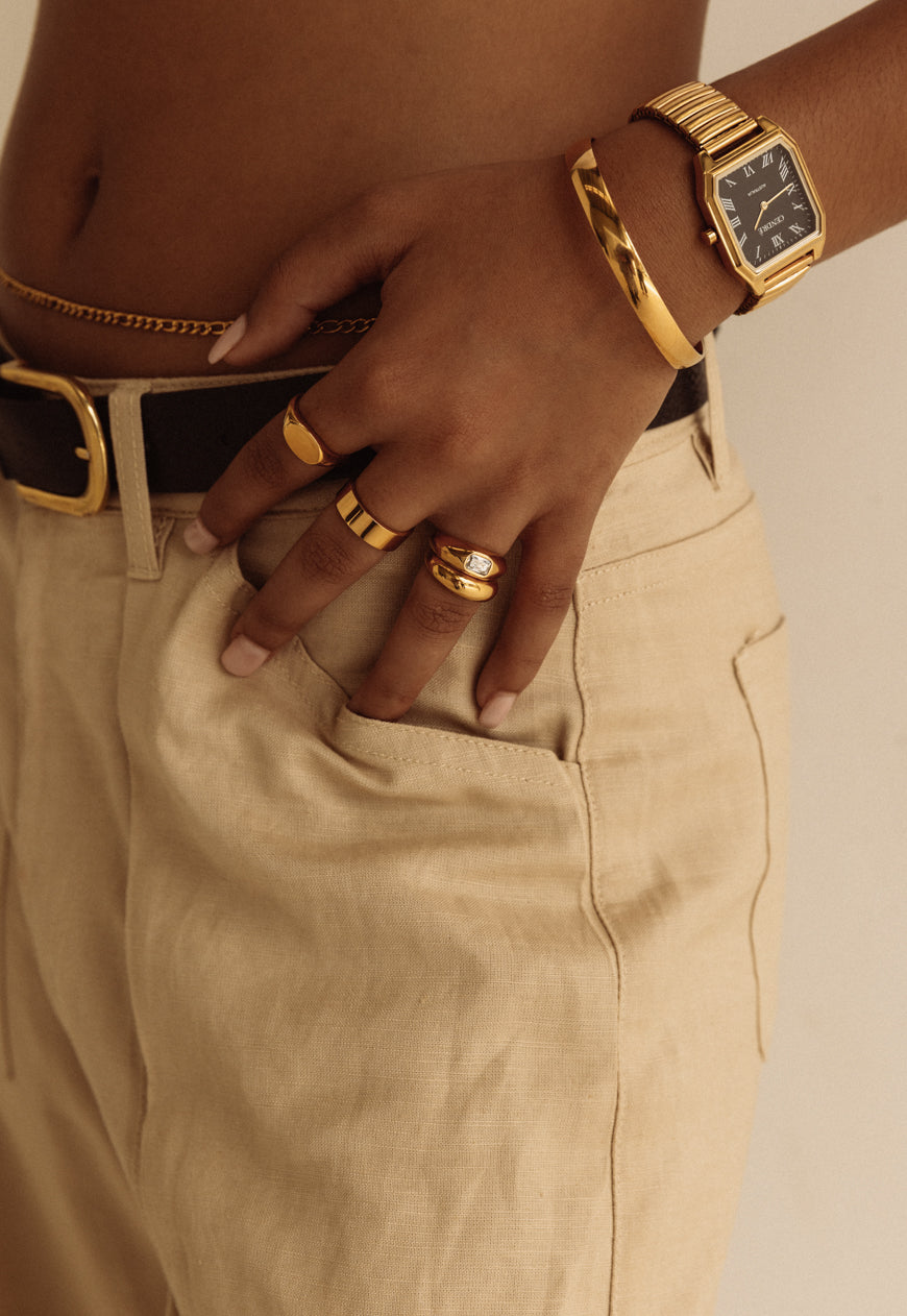Inspired by Hepburn's white gold, stackable eternity band, the Kendall Cigar Ring is a glorious celebration of all that glimmers. It is crafted from 18k gold plated stainless steel and features clear cubic zirconia stones in a classic pavé setting. This ring will add luminosity to any look and we recommend wearing it with your favourite minimal ensemble.