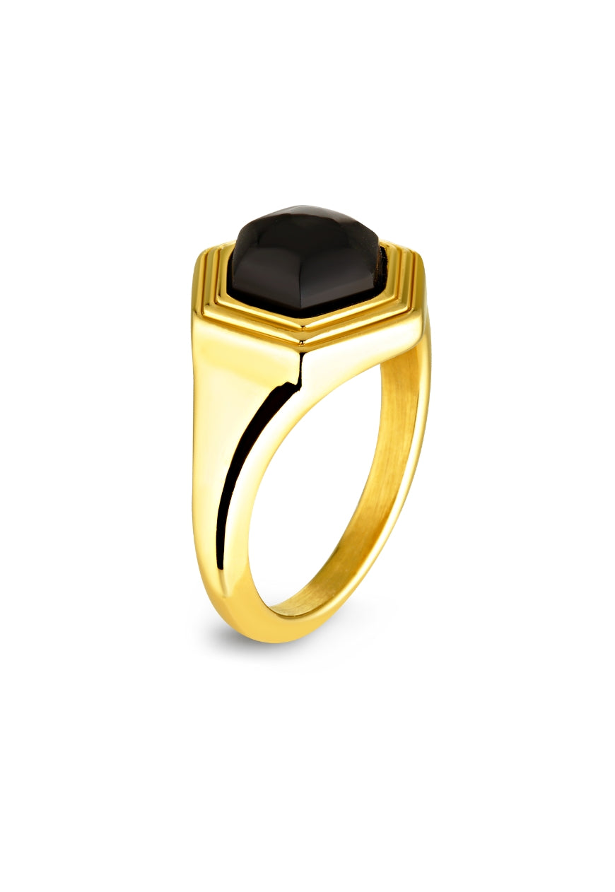 The Muse Ring is bringing forth an effortless nod to the quintessential seventies era with it’s vibrant showcase of mixed tones and high shine monochromatic detailing. With a square black cubic stone as it’s focus and presented on a geometrical towered silhouette, it marries perfectly with the Muse Earrings to provide a cohesive styling element.