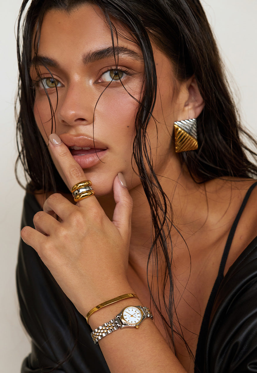 Rich, warm, and softly luminous – our signature gold finish. Designed to make a subtle statement, each piece is plated over high-quality stainless steel for enduring wear.