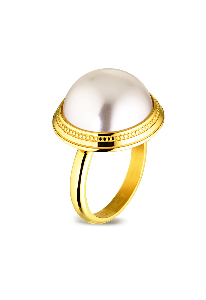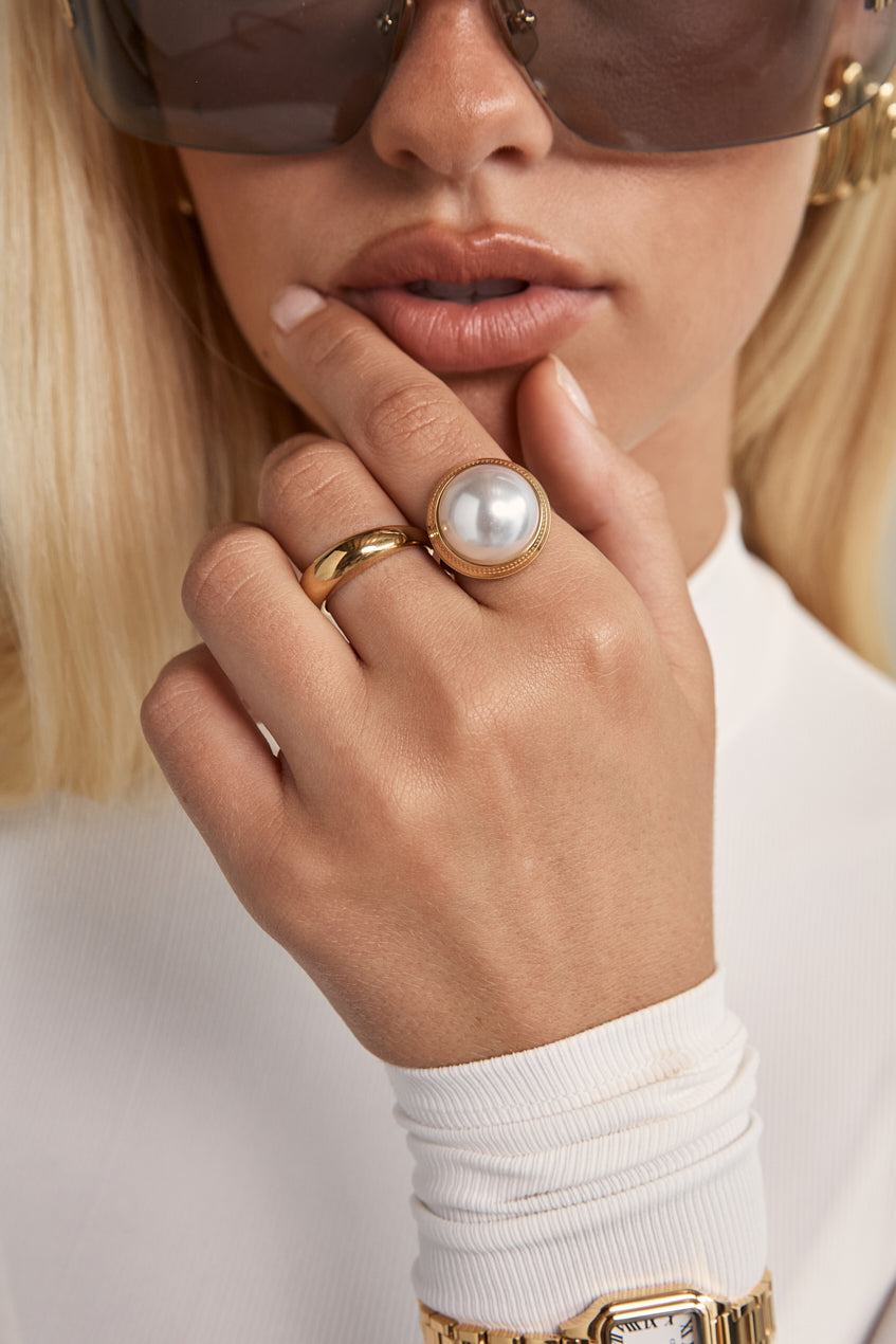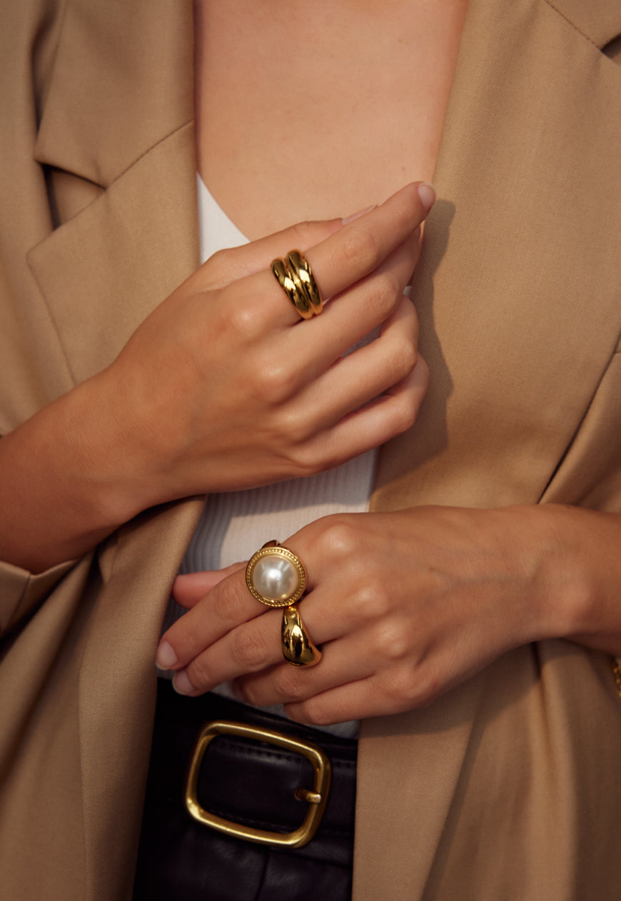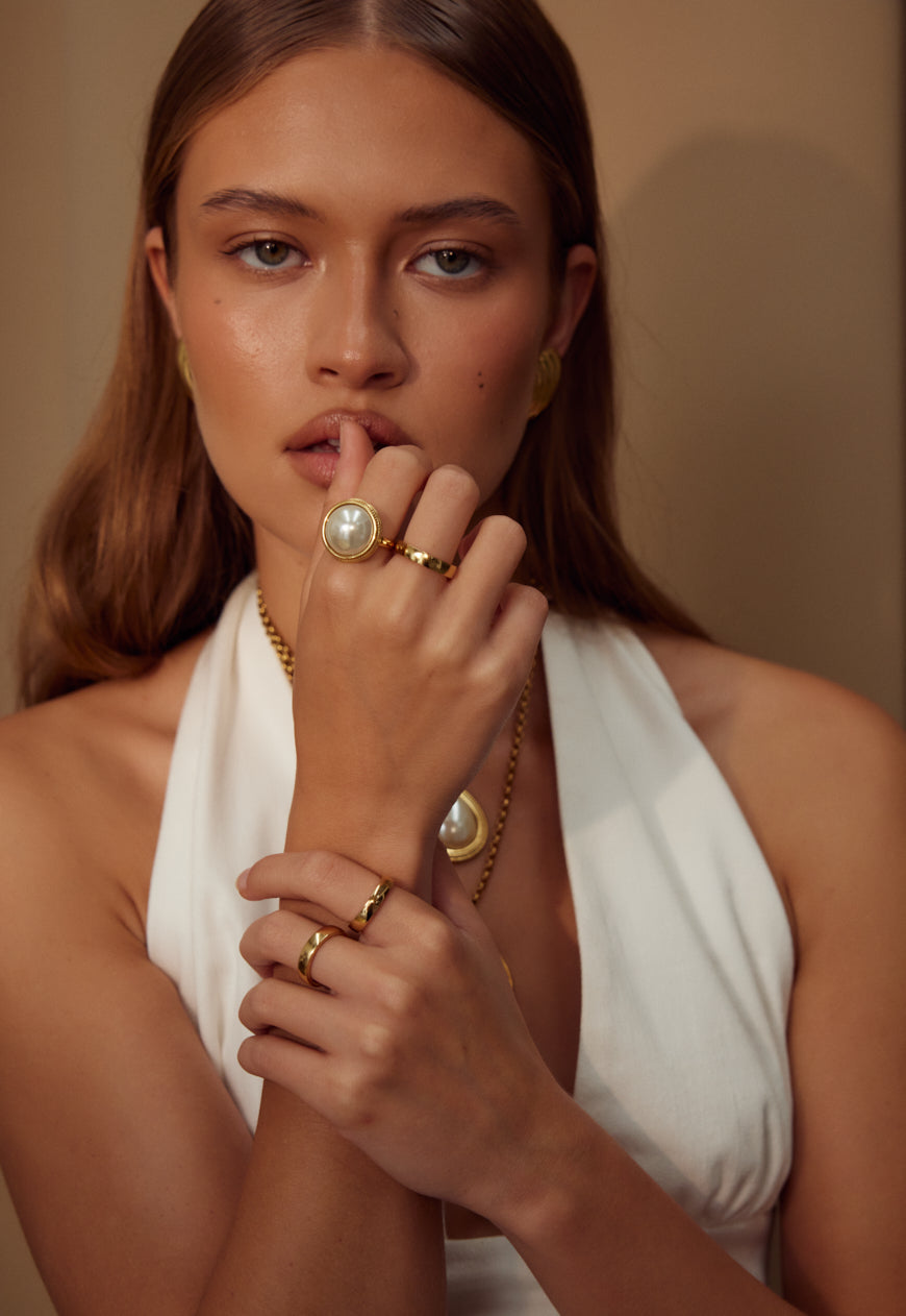 Introducing our Rue Cler Ring—an exquisite vintage-inspired adornment. Nestled within textured 18k gold-plated stainless steel, a lustrous white saltwater pearl takes center stage. The textured gold ring surrounding the pearl adds a touch of sophistication, evoking a romantic style reminiscent of an era when pearls were the must-have accessory.
