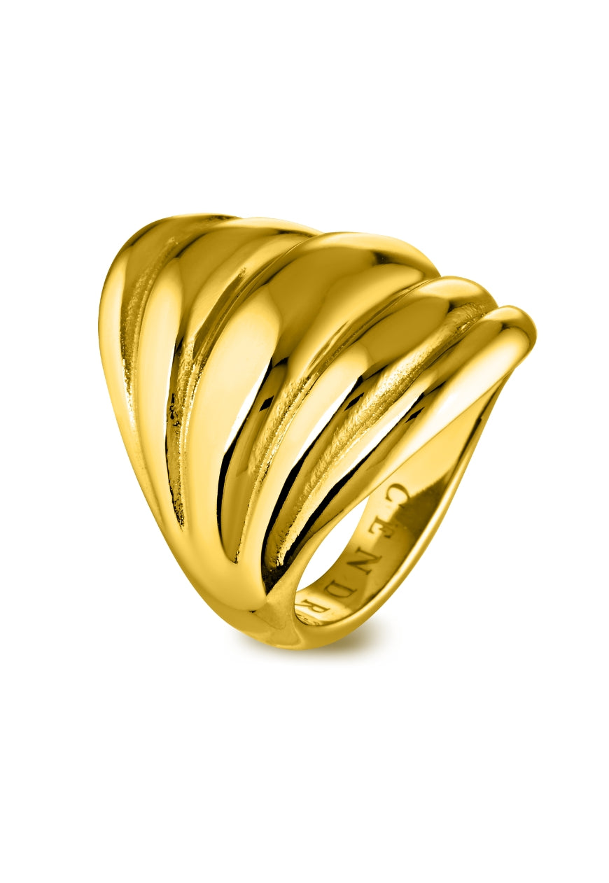 The Santino ring leaves nothing unsaid. It's uncomplicated sculptural essence paired with it's feature size and luxurious 18k gold-plated stainless steel contours, reintroduces a classic style into the forefront of women's styling.