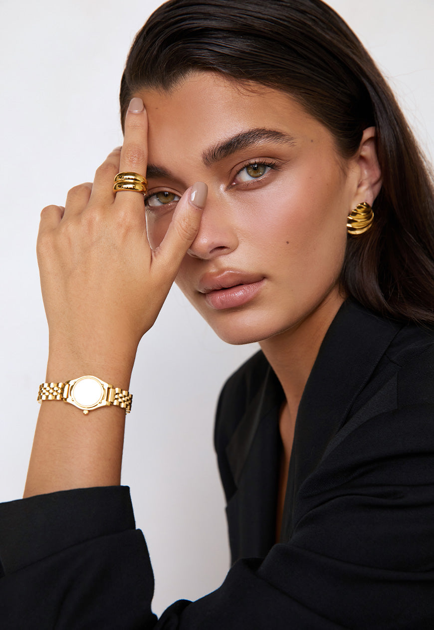 Rich, warm, and softly luminous – our signature gold finish. Designed to make a subtle statement, each piece is plated over high-quality stainless steel for enduring wear.