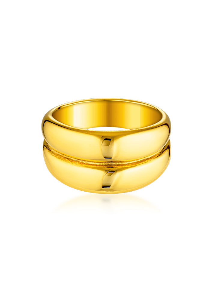Elevate the style stakes and go double or nothing by slipping on our Sofia Ring, a piece that'll help you master the art of style. This high shine, double stacked ring is crafted in 18k gold plated stainless steel and despite its polished outer, it has a smooth interior. This style is extremely versatile and can be paired with anything.