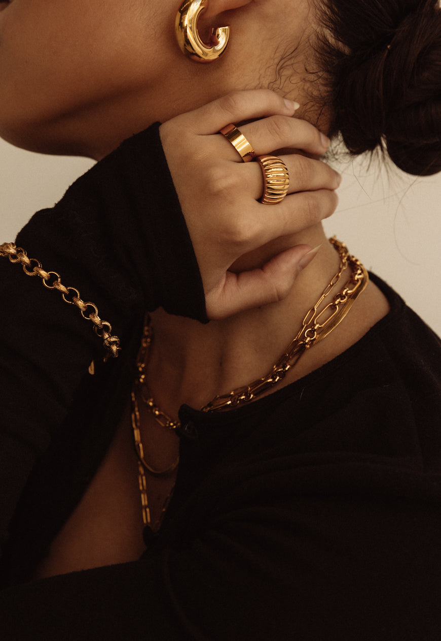 Rich, warm, and softly luminous – our signature gold finish. Designed to make a subtle statement, each piece is plated over high-quality stainless steel for enduring wear.