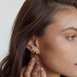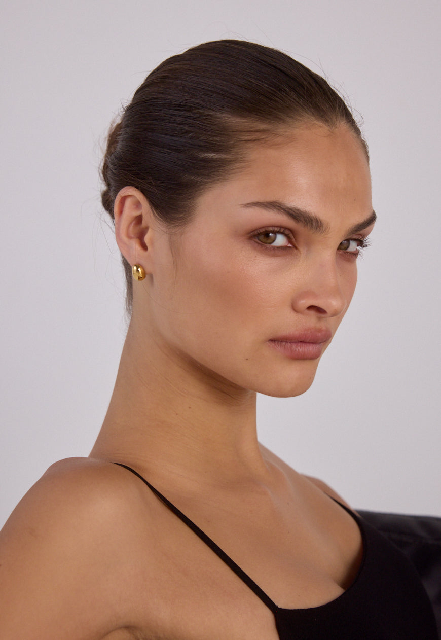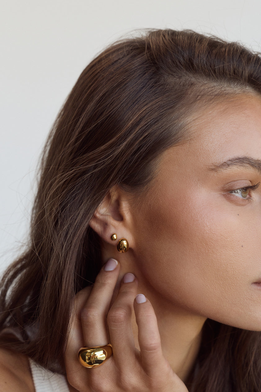 Discover the elegant Bean Earrings, featuring a rounded silhouette and petite bean-like shape. Crafted with 18k Premium Gold Plating on Stainless Steel, these earrings add a touch of sophistication to any outfit with their high shine finish.