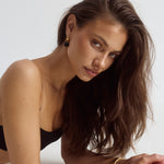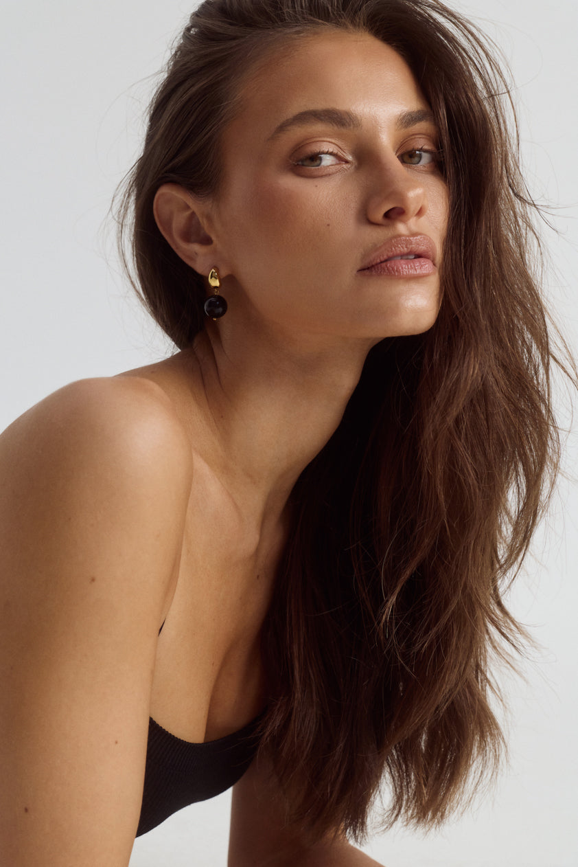 The Vera Earrings feature a smooth drop silhouette anchored by a rounded, domed base. Crafted from 18k gold plated stainless steel, paired with a black onyx pendant, this sculptural design brings quiet elegance to any look.